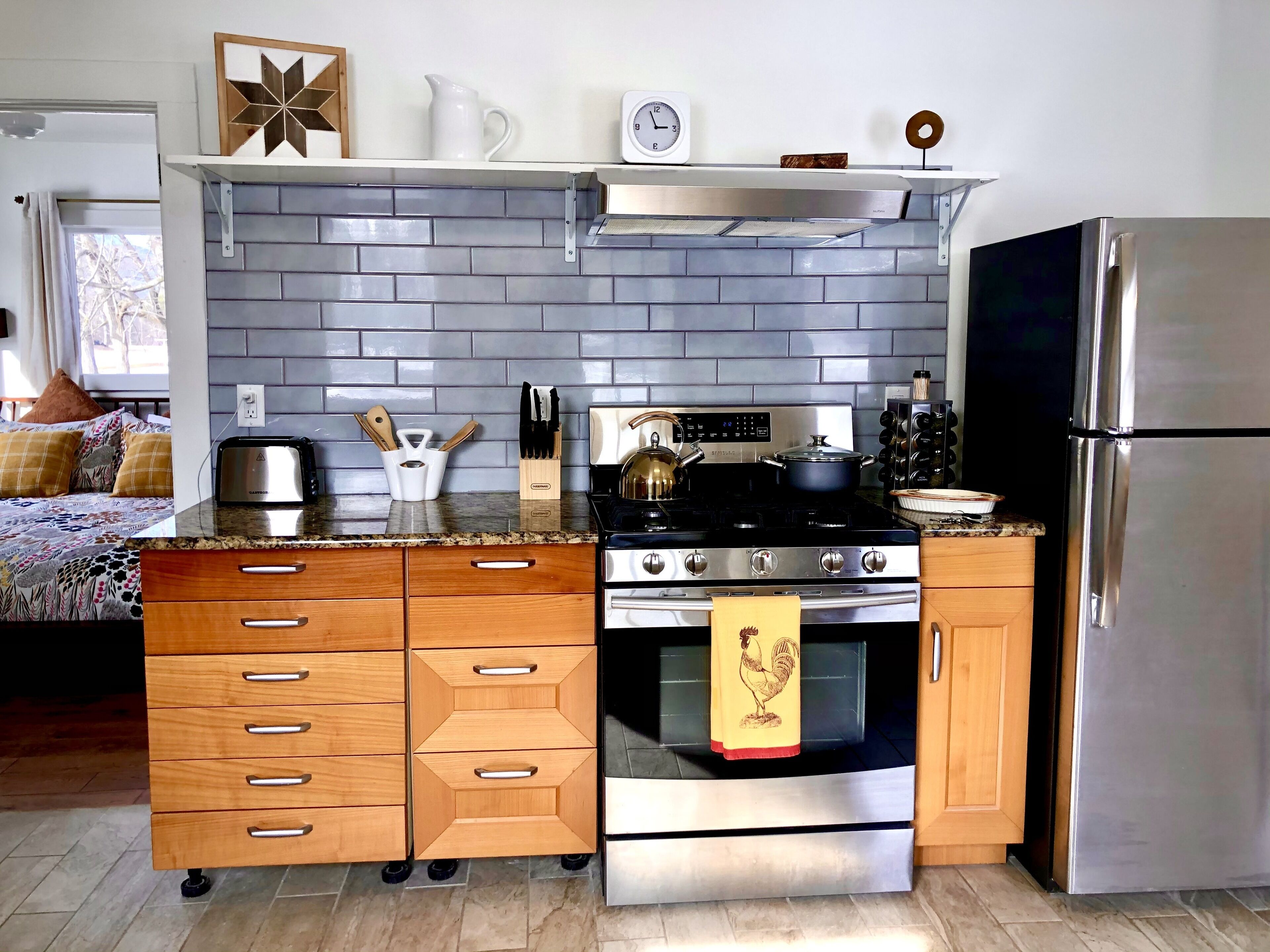 This cozy cabin was previously a pony stable that was converted into a finished studio. There is a king sized bed, high speed wifi, and a kitchenette with a stove, oven and mini refrigerator. We gut renovated the bathroom in February 2025.