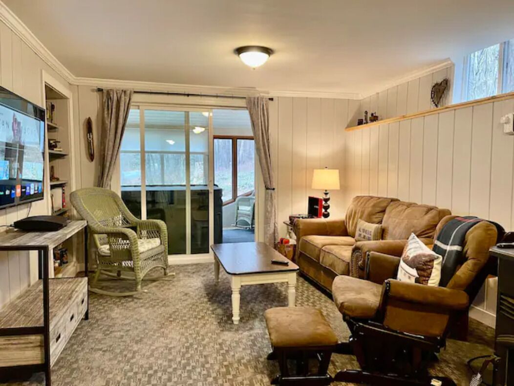 The sunken living room is spacious and has a 55" TV and AppleTV for watching movies and hanging out. Strong wifi (Spectrum Cable 100mbps) and cell service out here.