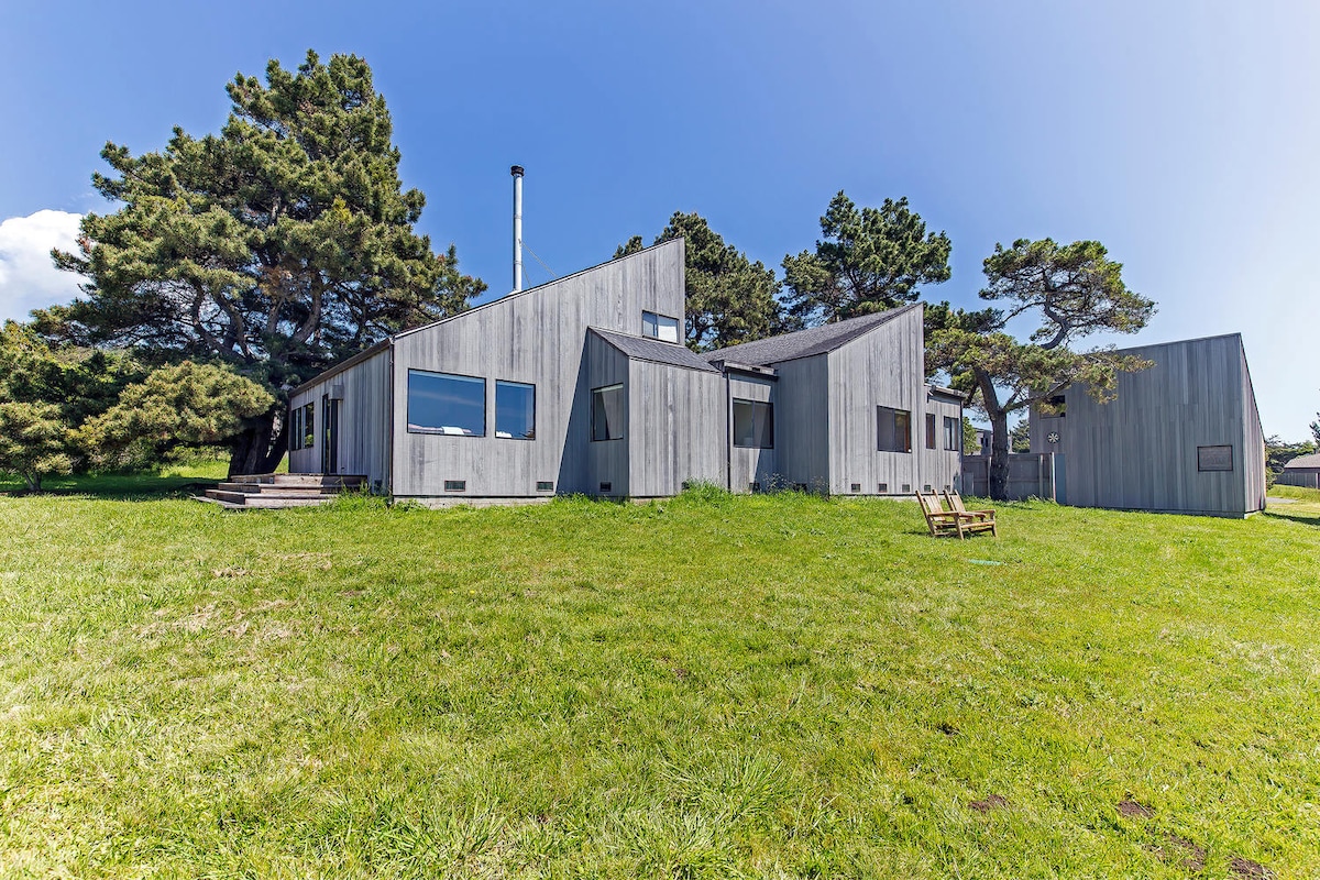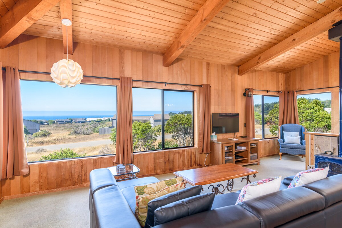 Grateful Getaway is a classic Sea Ranch vacation home featuring gorgeous views of the surrounding meadow and a partial ocean view.