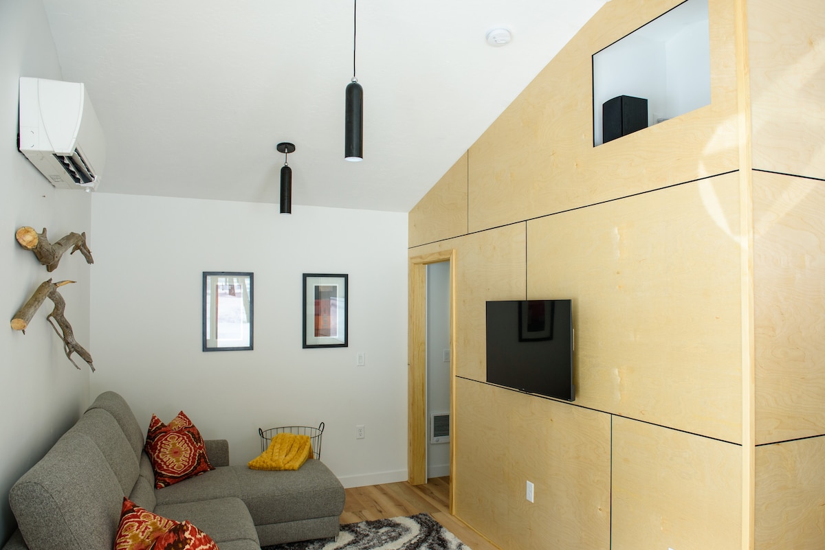 Step into a beautifully designed home featuring an open-concept living space, stylish finishes, and cozy yet elegant décor. The main living area boasts large windows that allow for plenty of natural light, creating a warm and inviting atmosphere. A comfortable seating area with plush furnishings makes it the perfect spot for movie nights or unwinding after a long day of exploring.