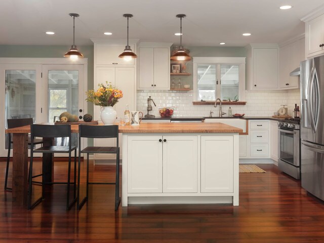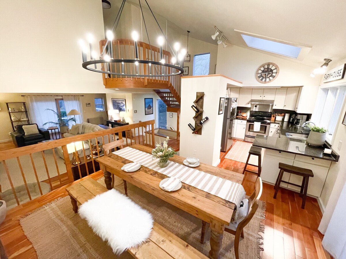 The downstairs floor plan is open and flowing, leading into an elegant living room with a fireplace and a wood stove, comfy sofas and chairs, and a majestic ten-foot farmhouse table, which can easily sit ten or more people for festive family meals.