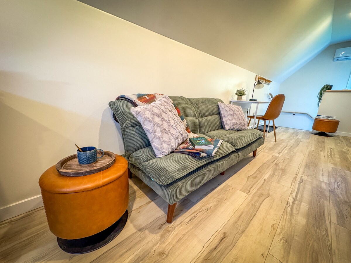 Our natural light, open floor space includes a cozy library nook and an antique dining table. In the evenings, spread out on the loungey, L-shaped couch in front of the flat screen, you can watch unlimited Netflix shows on our account or sign into any of yours to watch Hulu, Apple TV, Disney+, Peacock, HBO Max etc.