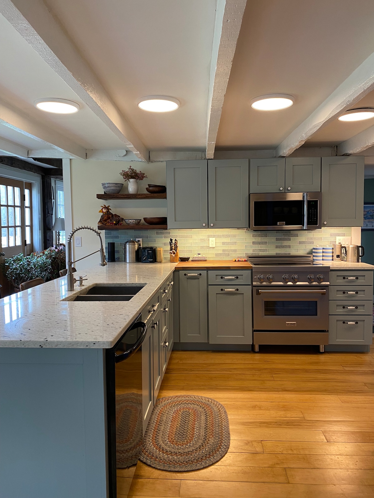 The modern kitchen is equipped with all brand new LG appliances, including a gas stovetop/ electric oven and a beautiful farmhouse sink. We provide pots, pans, dishes and all utensils. We also have available a Keurig for coffee, or you can use our stainless steel french press and coffee grinder. There’s a number of different tea bags as well as a Breville electric Kettle.