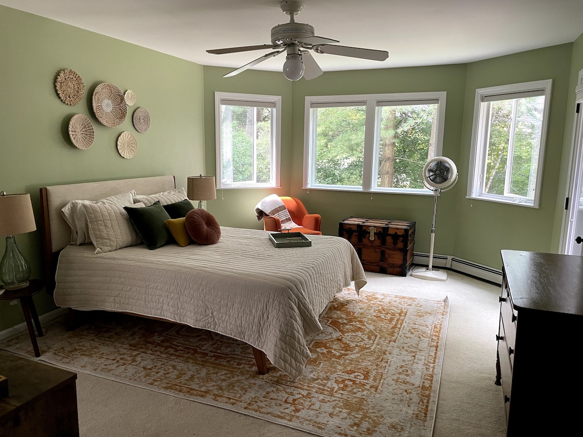 Extra large bedroom with full bathroom over 3-car garage. Separate staircase leading to a quiet, private, relaxing space. 1 mile to Shelburne Farms. Newly renovated bathroom.