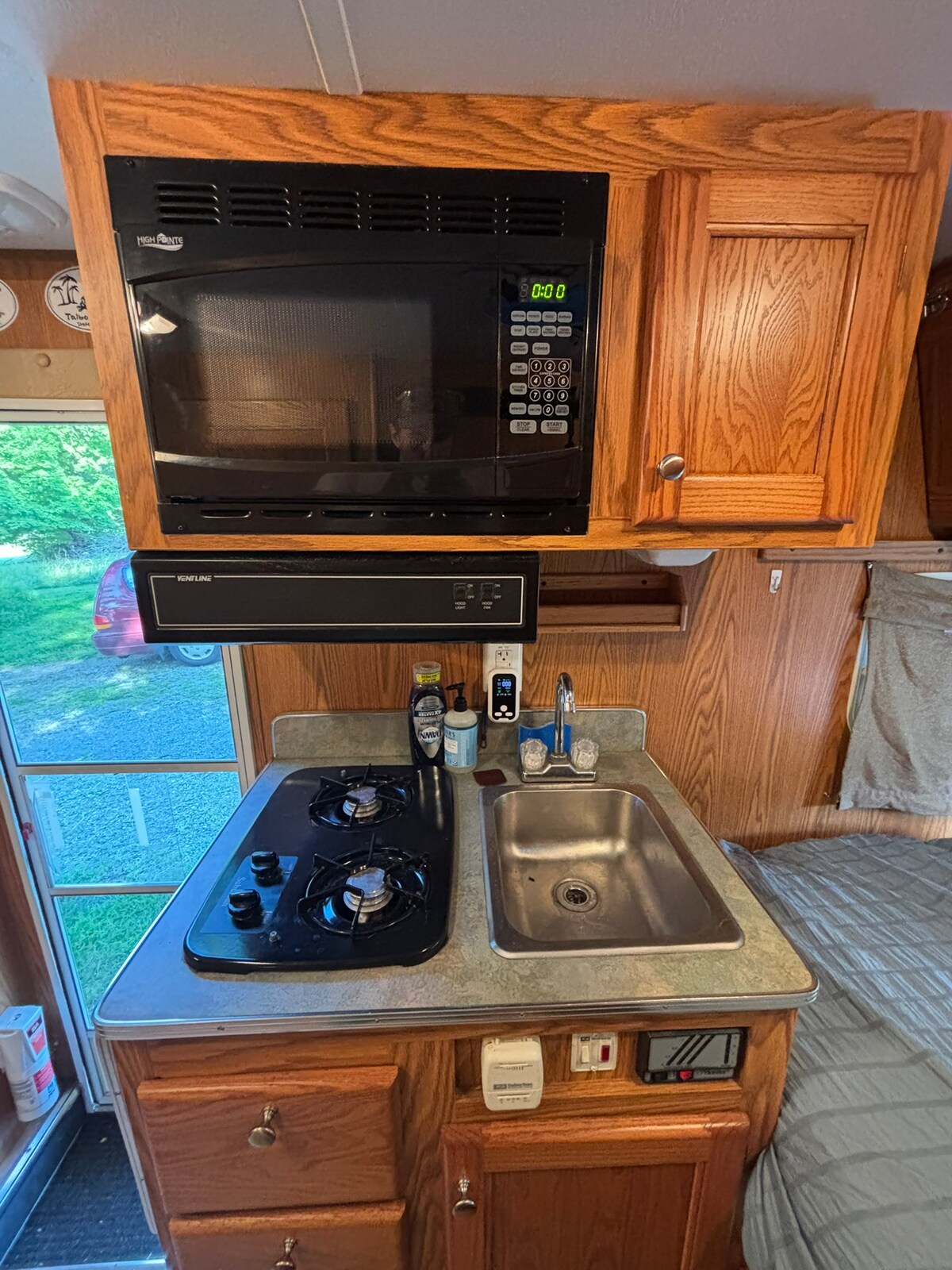 Kitchen fully equipped with refrigerator, freezer, microwave, electric oven and range stove, coffee maker and grinder, electric kettle, etc.