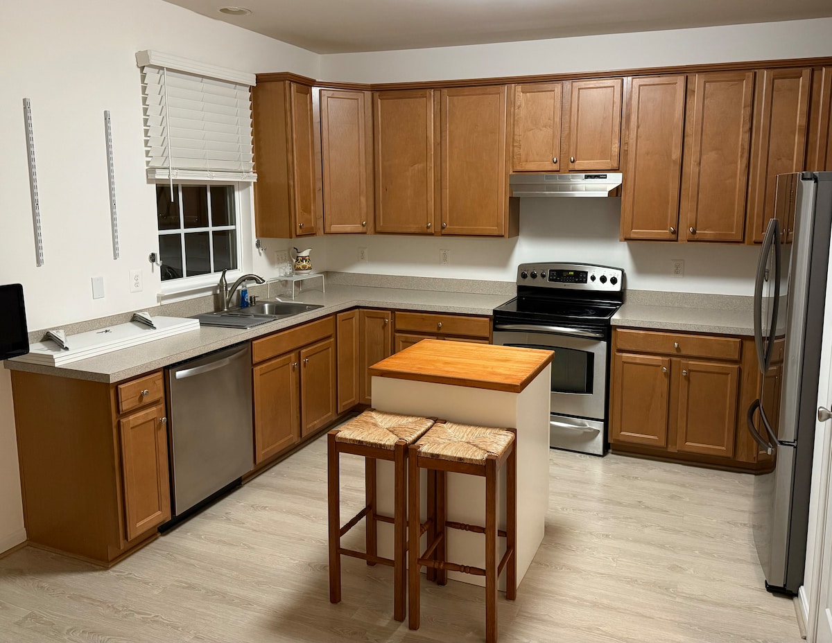 New beds, bedding, and towels. Large laundry room with iron and ironing board. Kitchen is stocked with cooking implements, plates, utensils, and spices.