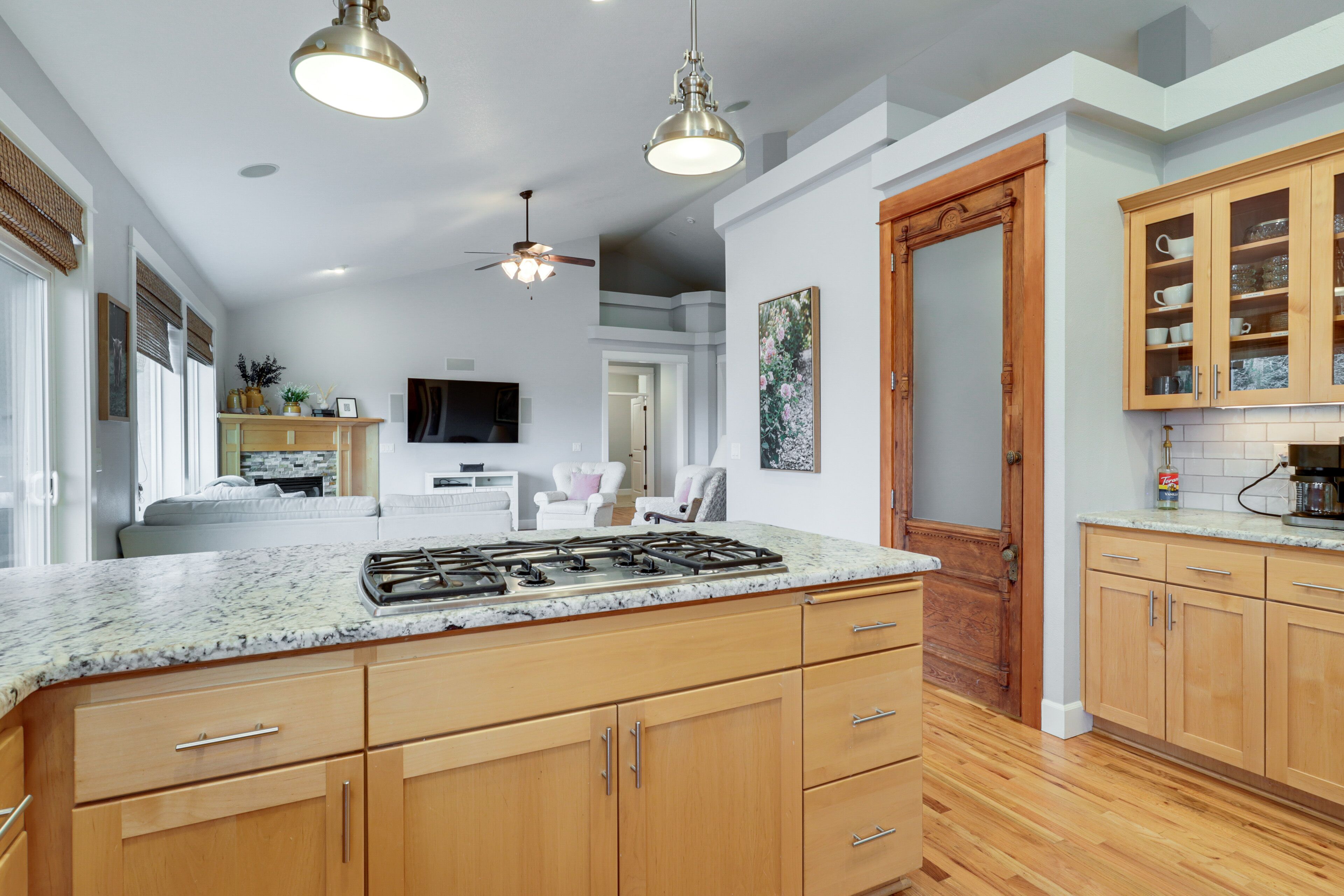 Just past the front threshold, you step into a mixed use living and dining room area. This room has the essentials and much more: comfortable chairs, cozy couch, TV, dining table and fully stocked game cabinet. Sink into the wingback chair with a photography book and a blanket. Pick up the guitar, ukulele, banjo or hand bells and lose yourself in the music.