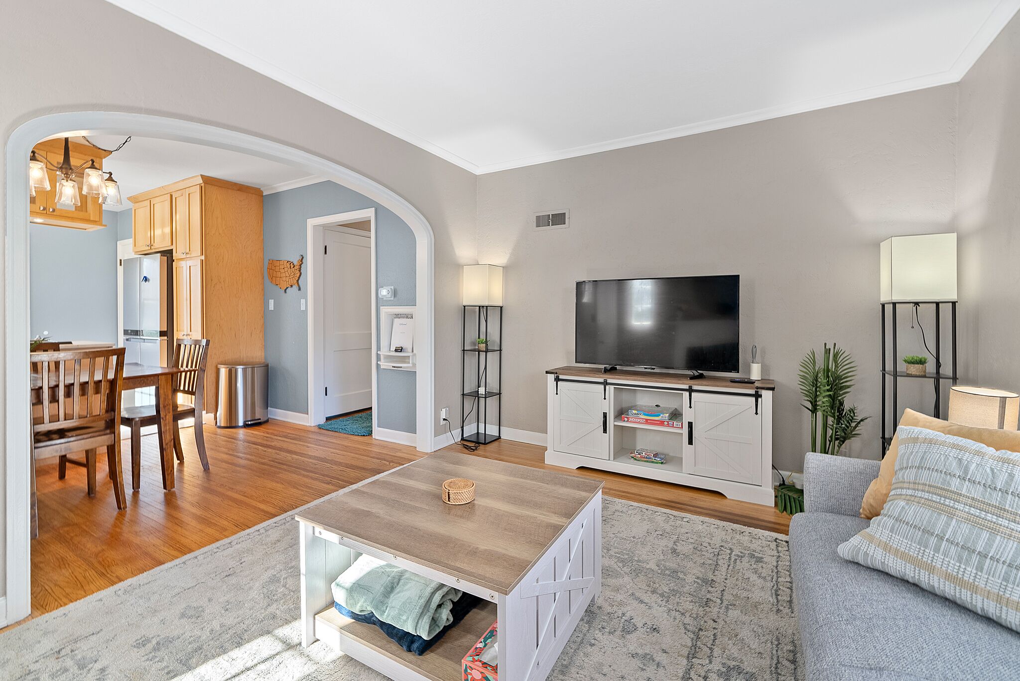 The perfect place to stay for work or play (or a stopover through town)! Curl up in front of the fireplace on the full-sized couch and stream your favorite shows on the 48” LED TV (Netflix only, no cable) or take a break from relaxing and get some work done on the desk. Eat takeout on the high-top table in the kitchen or make your own meal with the full-sized kitchen. The place is fully stocked, from dishes and silverware, fresh towels and sheets, to soap and shampoo.