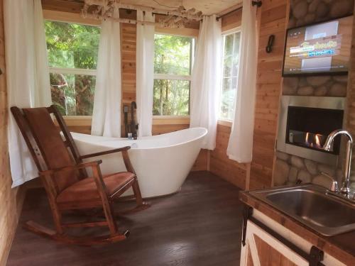 Main floor: Small kitchenette, cozy living area with stone fireplace, HD TV, futon (perfect for an older child to come along), and a luxurious soaking tub