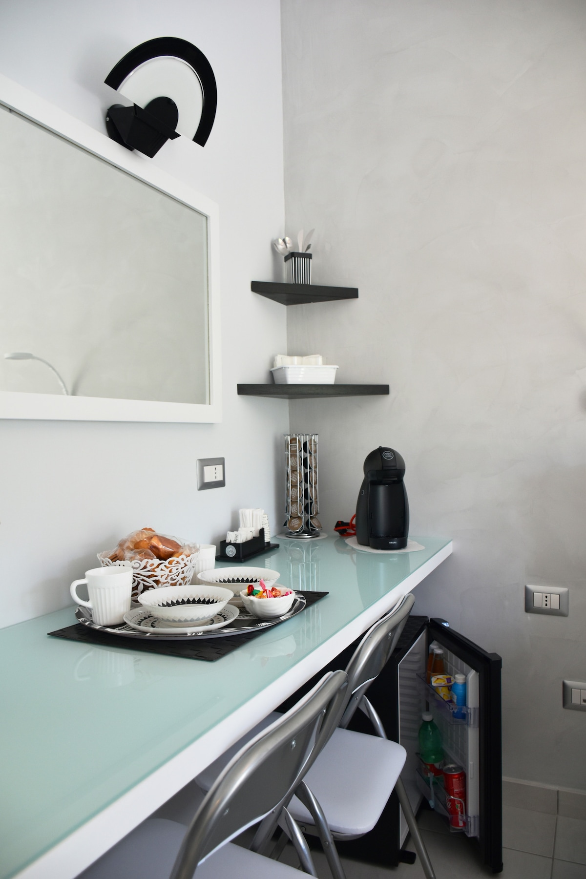 An Italian breakfast is included and consists of a selection of packaged products (croissants, plum cake, toast, biscuits, cereals, jam, Nutella) and coffee capsules.