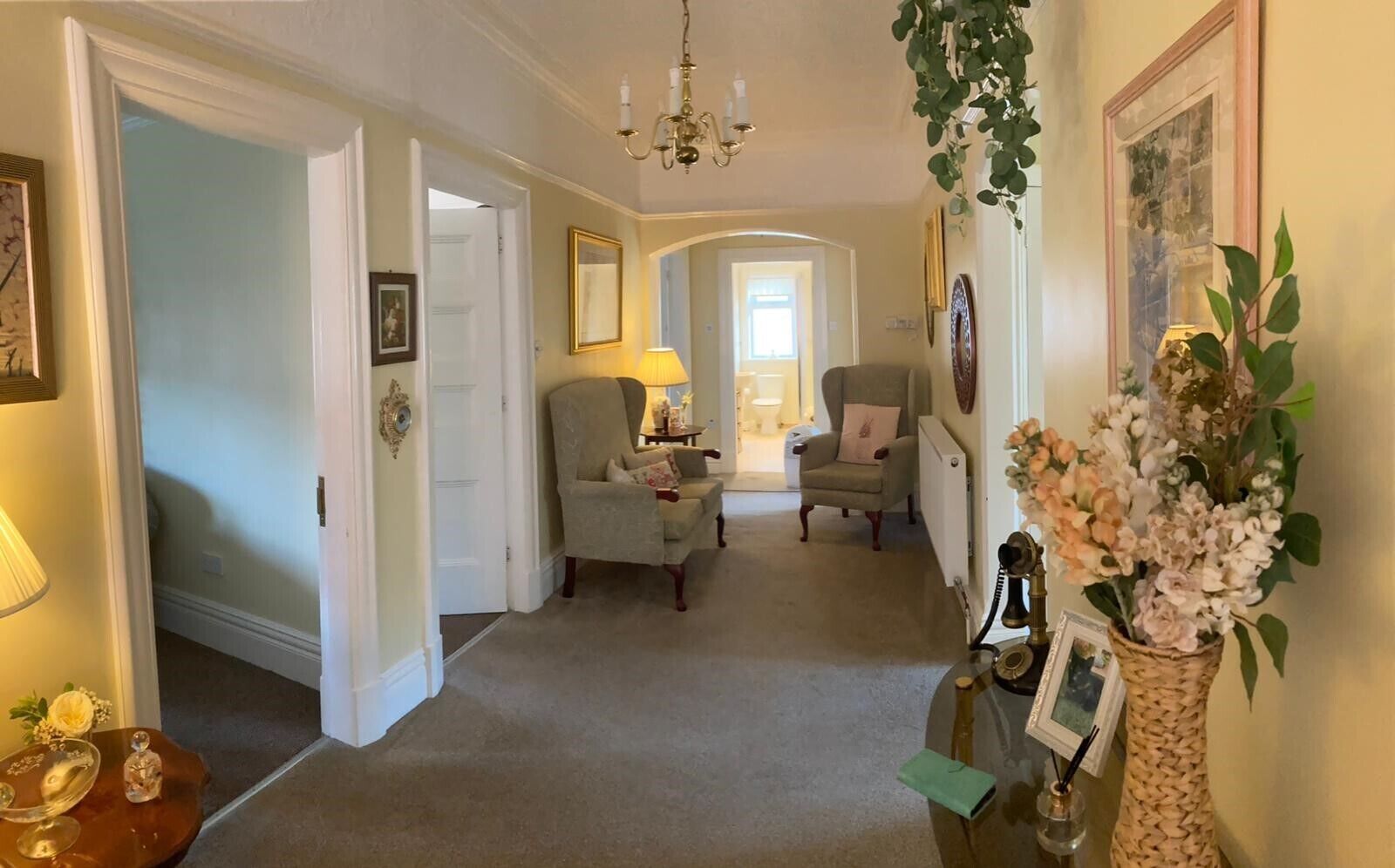 Hall, landing, shared bathroom, private bedroom.