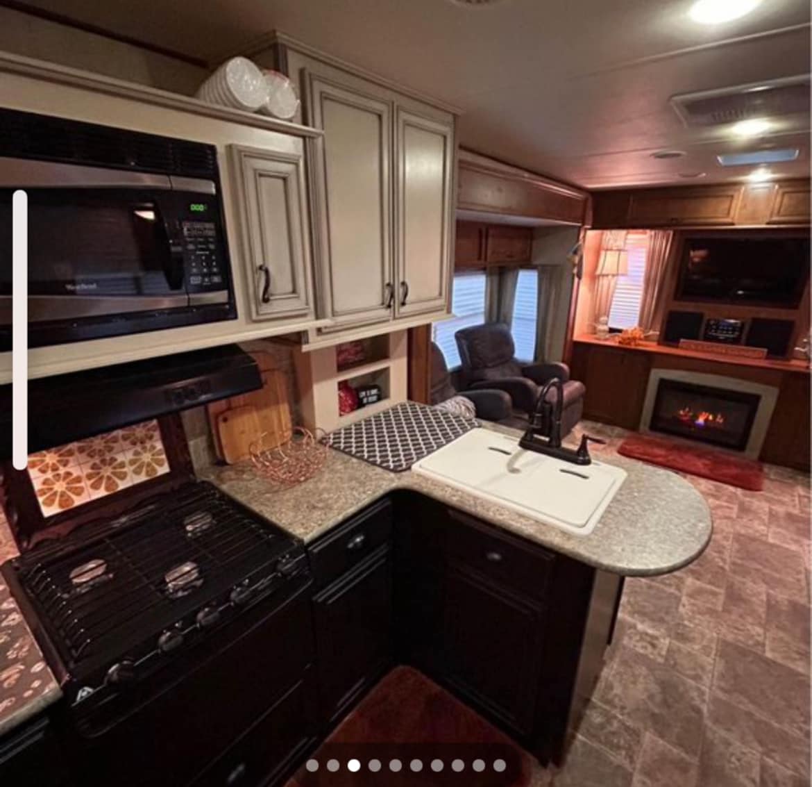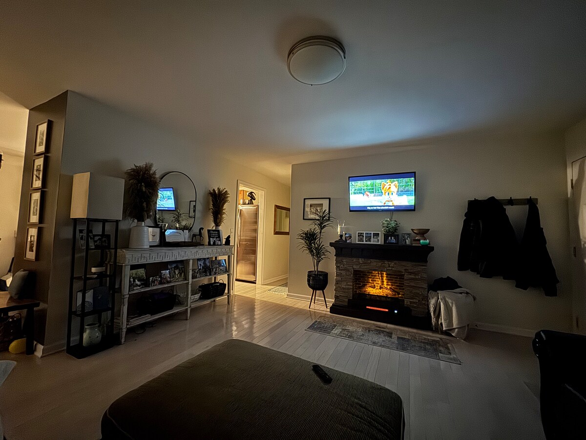 In the living room you’ll find a large 3 part sectional perfect for sleeping, napping, or tv/game night. Can sleep up to 3 people. Hutch full of games, printer, and books for entertainment purposes. Fan and dimmable lighting for comfort and enjoyment.