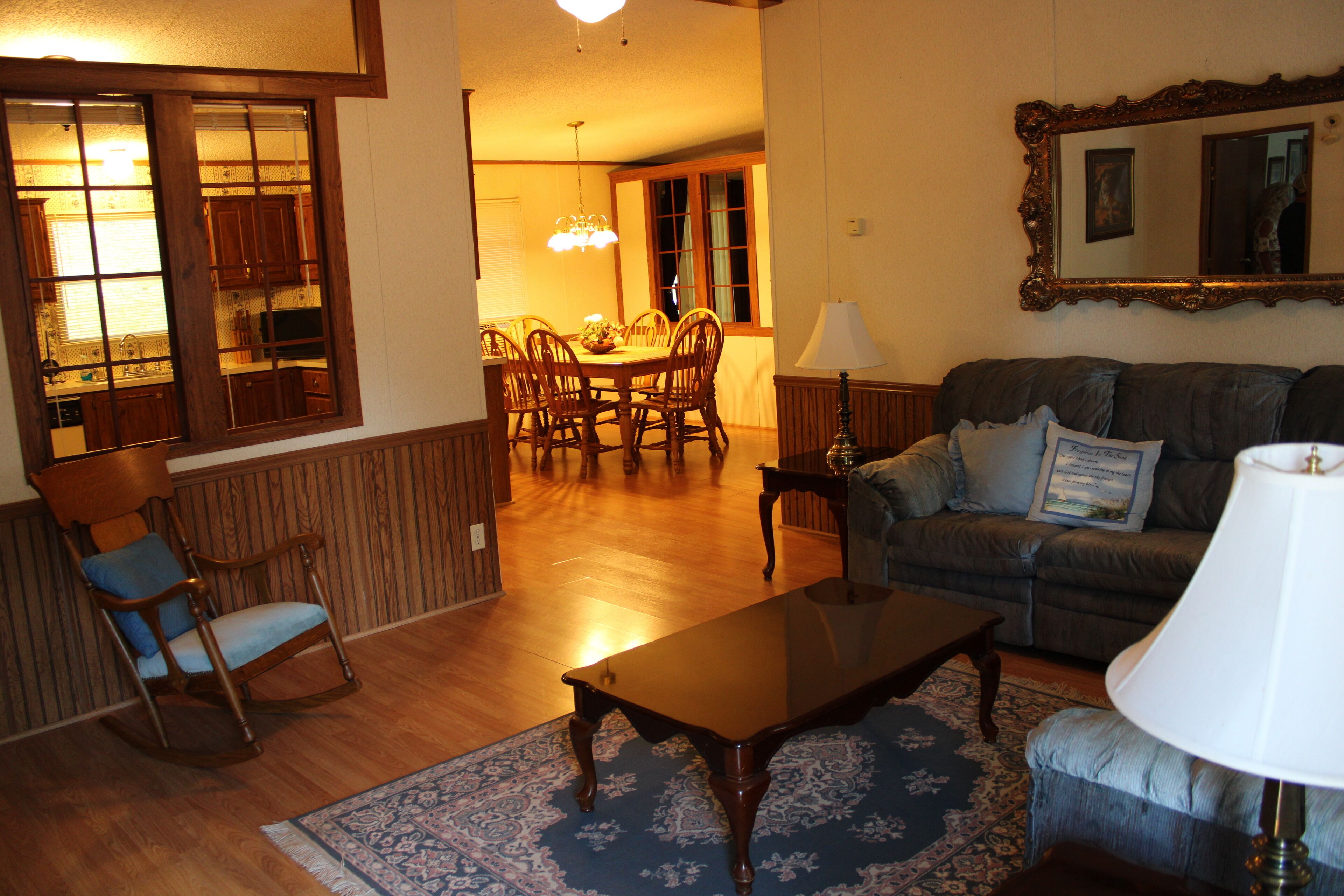 Off the other side of the stove room you have access to the old log cabin section of the house. There is a very large fireplace with two large couches. It also has the dining area, with a large art deco table that can sit up to 12 people.
