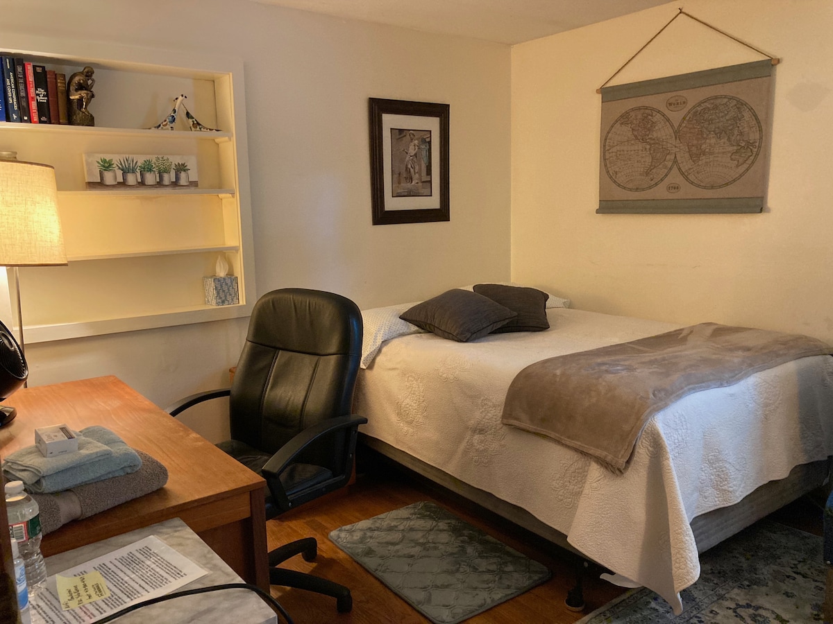 This room has only one window so if there is an AC unit installed (summer), please do not try to open the window or the unit will fall to the ground. The house is located in a lovely residential neighborhood, a one mile circle with conservation area and pond in the center, across the street from the house. Neighbors walk, many with dogs and kids, a fun walk to admire the surrounding nature. The room itself is 12' x 12' with an area rug on hardwood floor. There is a double sized bed, desk, 2 chairs and a bureau. It is adequate for short or long term stays. Room has one window that overlooks the back yard, as does the attached bathroom. This room is close to the men's bathroom and the kitchen as well as the front entrance.