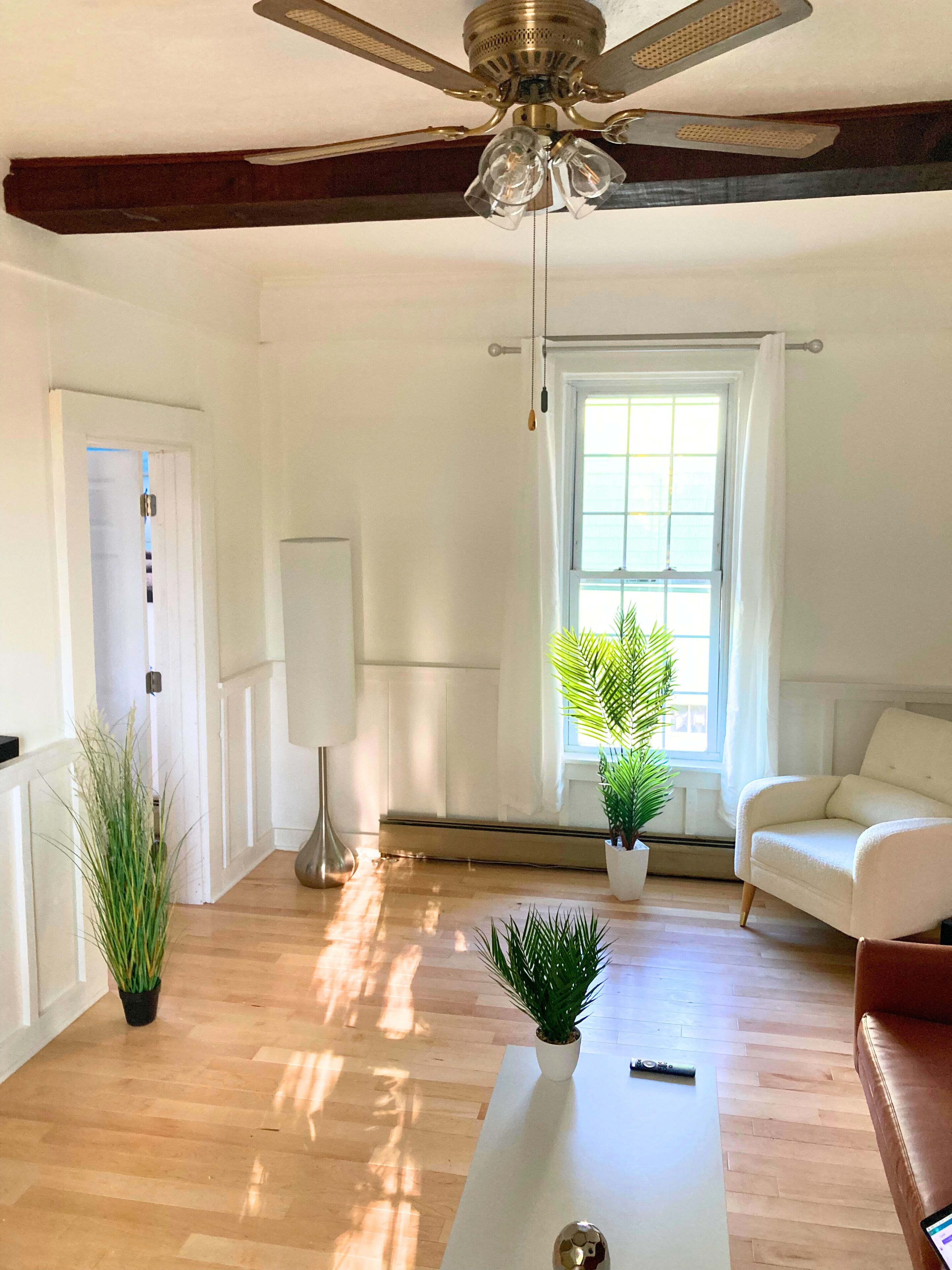 This beautiful newer space has hardwood floors, a comfortable queen bed, large windows with blackout shades, central heat, ceiling fan, A/C, and plenty of closet space. There's also room to move around, as well as a yoga mat you can use.
