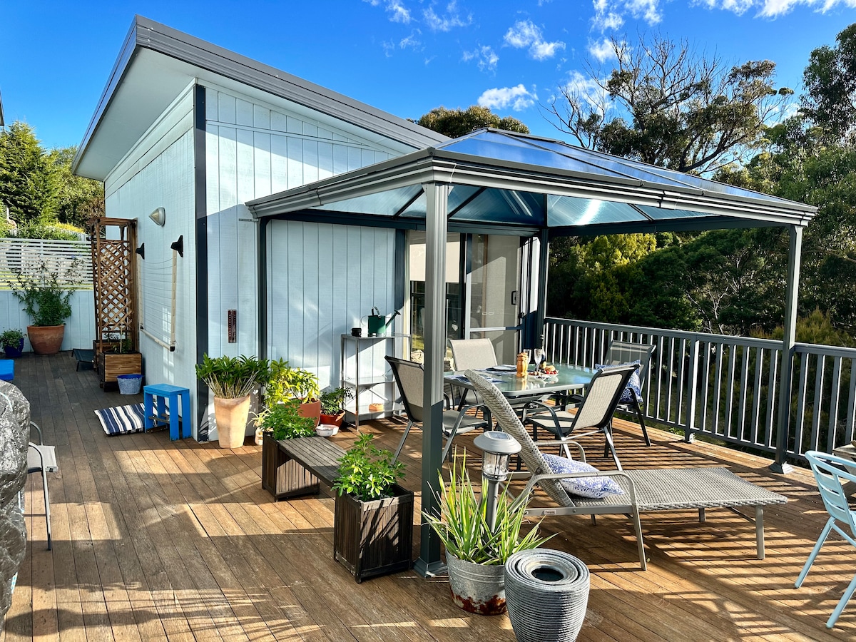 A tranquil separate bungalow on our deck, backing onto bush with water views towards Medeas Cove in St Helens the gateway to the Bay of Fires