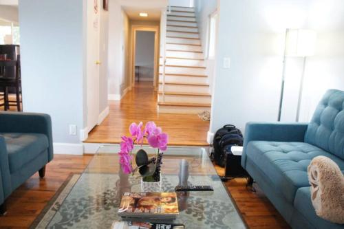 This duplex home comes with 2 car tandem parking and electronic smart lock for self check-in. You will find the spacious living room equipped with 50” flat screen TV with Netflix included.