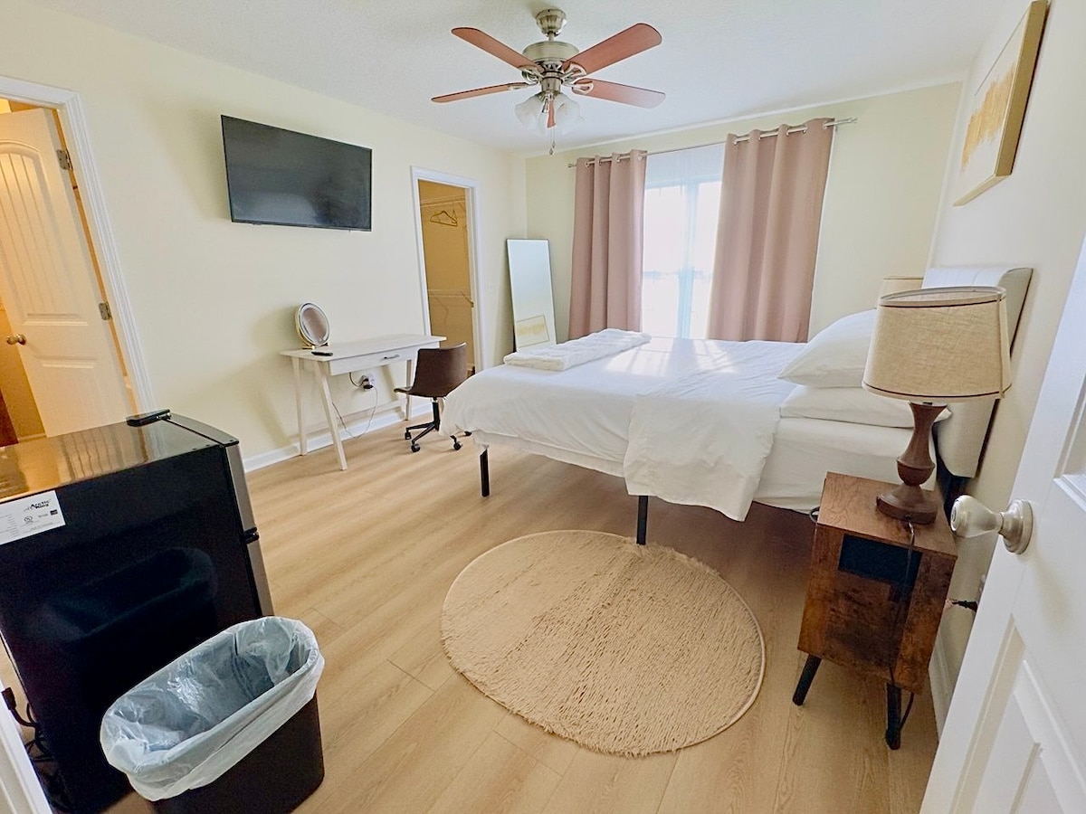 “The Margaret” (Door #3) is on the top level of a private home located in a quiet and safe neighborhood. With hardwood floors throughout, this spacious area offers 1 tastefully decorated bedroom with a newly renovated full bath. We have recently added a hospitality suite with a full refrigerator, microwave, toaster, keurig and slow drip coffee maker and a 5 gallon purified water dispenser. A basket of goodies are to be enjoyed by all our guests as supplies last.