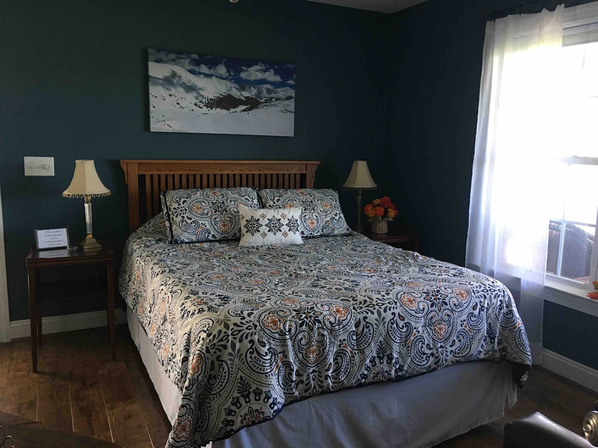 You will be greeted by a cozy master suite all your own. A quiet space with a queen bed. Coffee/Tea bar complete with hot chocolate and cider. There is a refrigerator and a microwave available for your convenience. Roomy closet with hangers. After a long day, soak in the jetted tub or take a nice hot shower and relax on the loveseat when chilly or porch when its warm. Please join us!