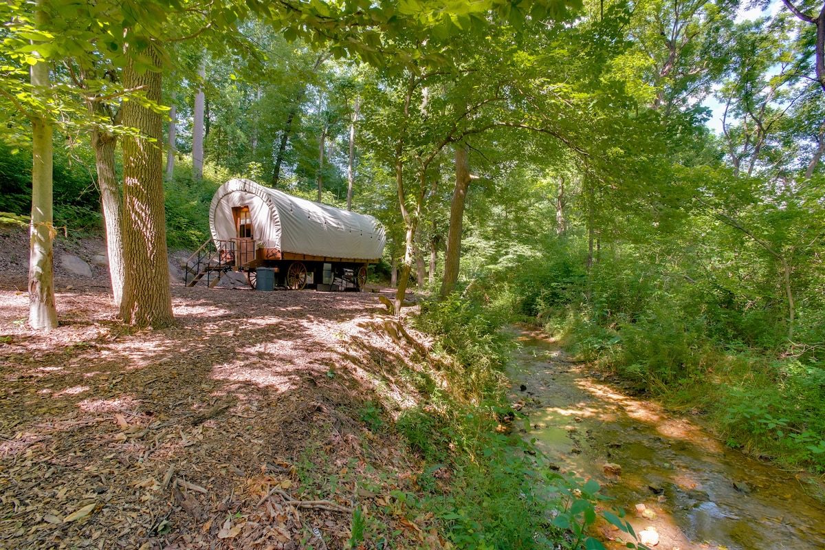 Welcome to our cozy covered wagon, nestled in the peaceful woods along a creek. This unique camping experience offers a one of a kind getaway for nature lovers seeking tranquility and relaxation. Step outside to enjoy the fresh air, go for a hike, or simply unwind by the camp fire.
