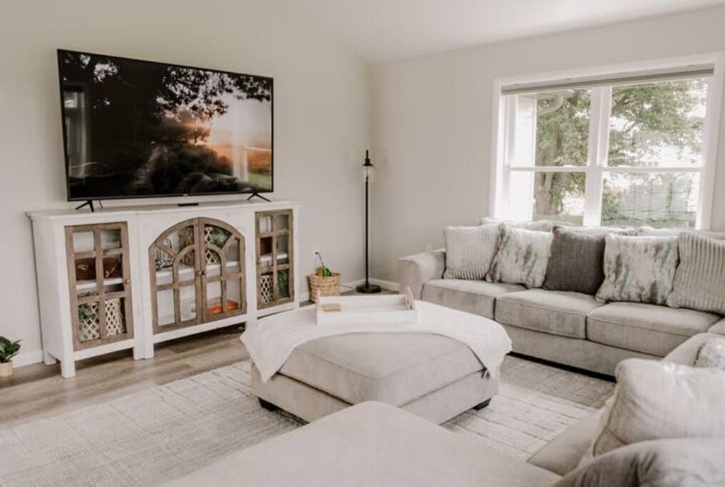 Outside offers a beautiful,spacious backyard where the options of games are endless should you choose to bring your outdoor games with you. Start up a fire in the campfire pit surrounded by Adirondack chairs and experience over the fire cooking or fire up the grill on the back deck and cook up the local, grass fed meat that we have provided for your stay. You have a choice of sipping your morning coffee on one of the patio chairs on the front porch or by the sectional lounge area in the back deck.