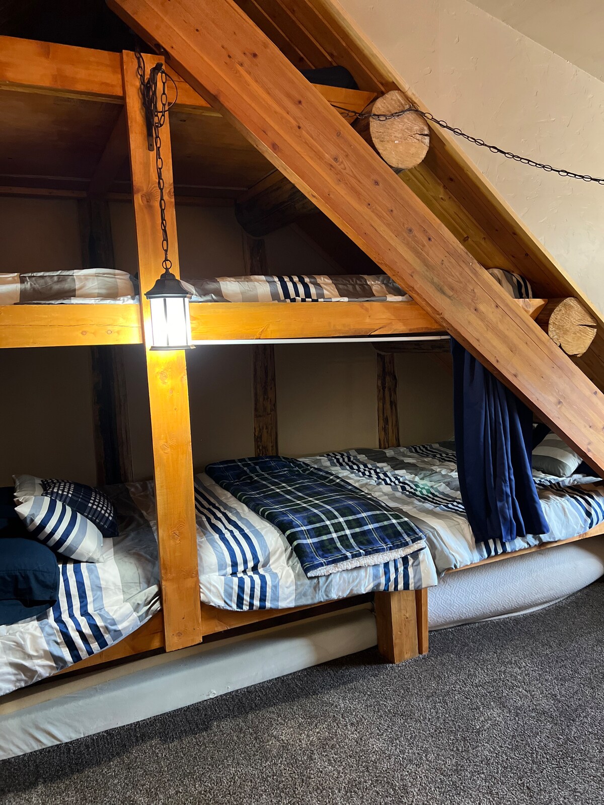 Our home is small in square footage (650sf) but feels open with vaulted ceilings and lots of windows. The kitchen is stocked to cook a full meal and has a two-person eating bar and two-person dining table. The living room has a massive comfy couch, a big internet/cable connected TV, and a wood stove (wood is provided). There is a large balcony with table/chairs, gas grill, and views to distant peaks. The bedrooms are super small but functional: one has a queen bed and the other has a built-in bunk bed. The bathroom has a slate shower (no bathtub) and a reclaimed vanity with carved rock sink. We provide shampoo/conditioner/body wash. There is free uncovered parking.