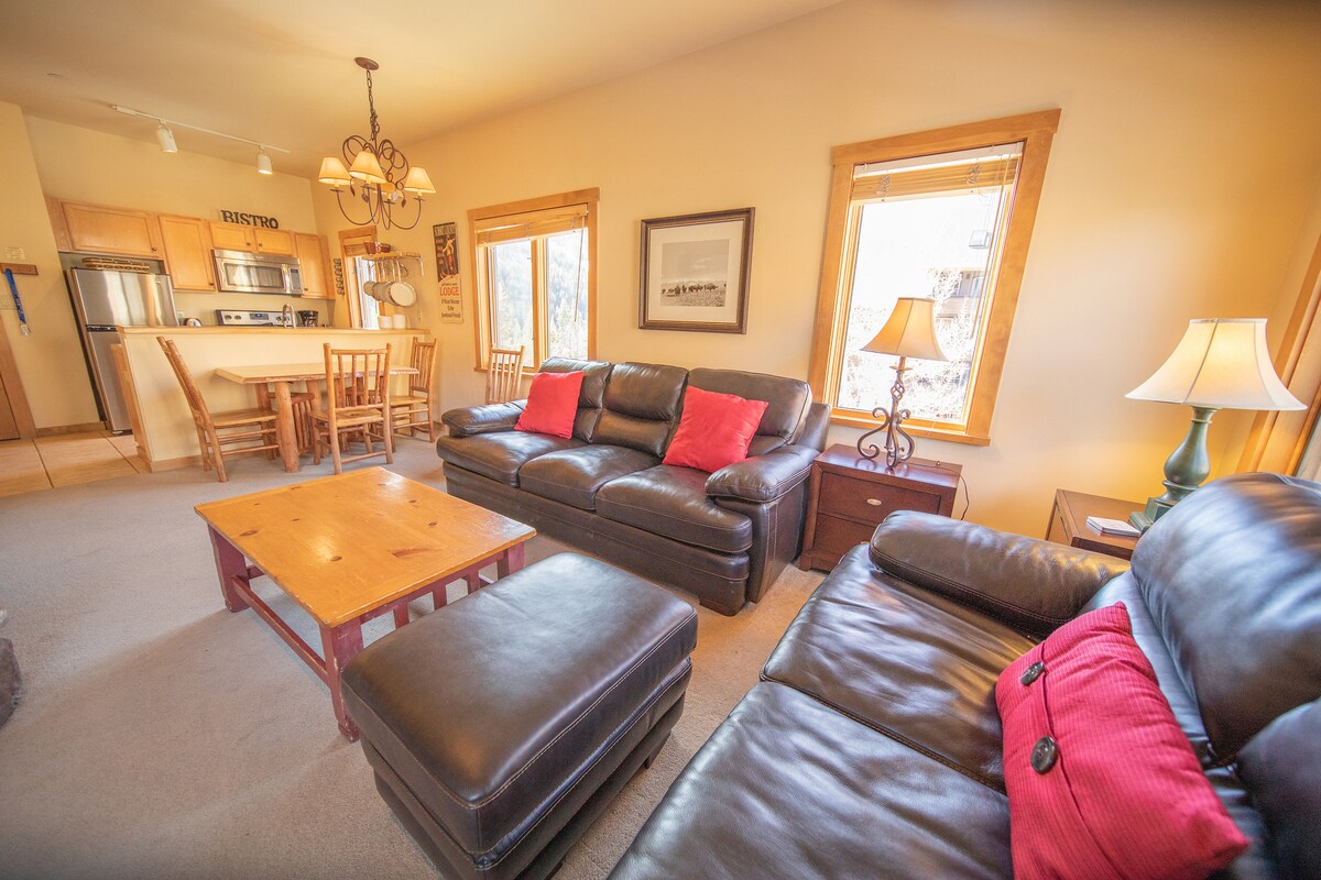 Micro two bedroom nestled in the trees about one mile south of downtown and the ski area. Decorated in a hip mountain-modern style, we have everything you'd need for a fantastic woodsy getaway. Sit on the massive sofa and stream a movie or enjoy the treetop setting from the large deck. This place is way cooler than your typical ski condo. Not ski-in, ski-out and not right in town, but hiking trails and the free town/ski shuttle are a few hundred feet away. Or walk about a mile to Main Street.