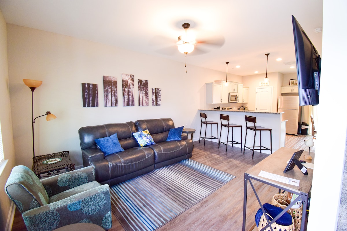 Inside you will find a huge kitchen, with tons of working space, a cozy living room and 50” tv.