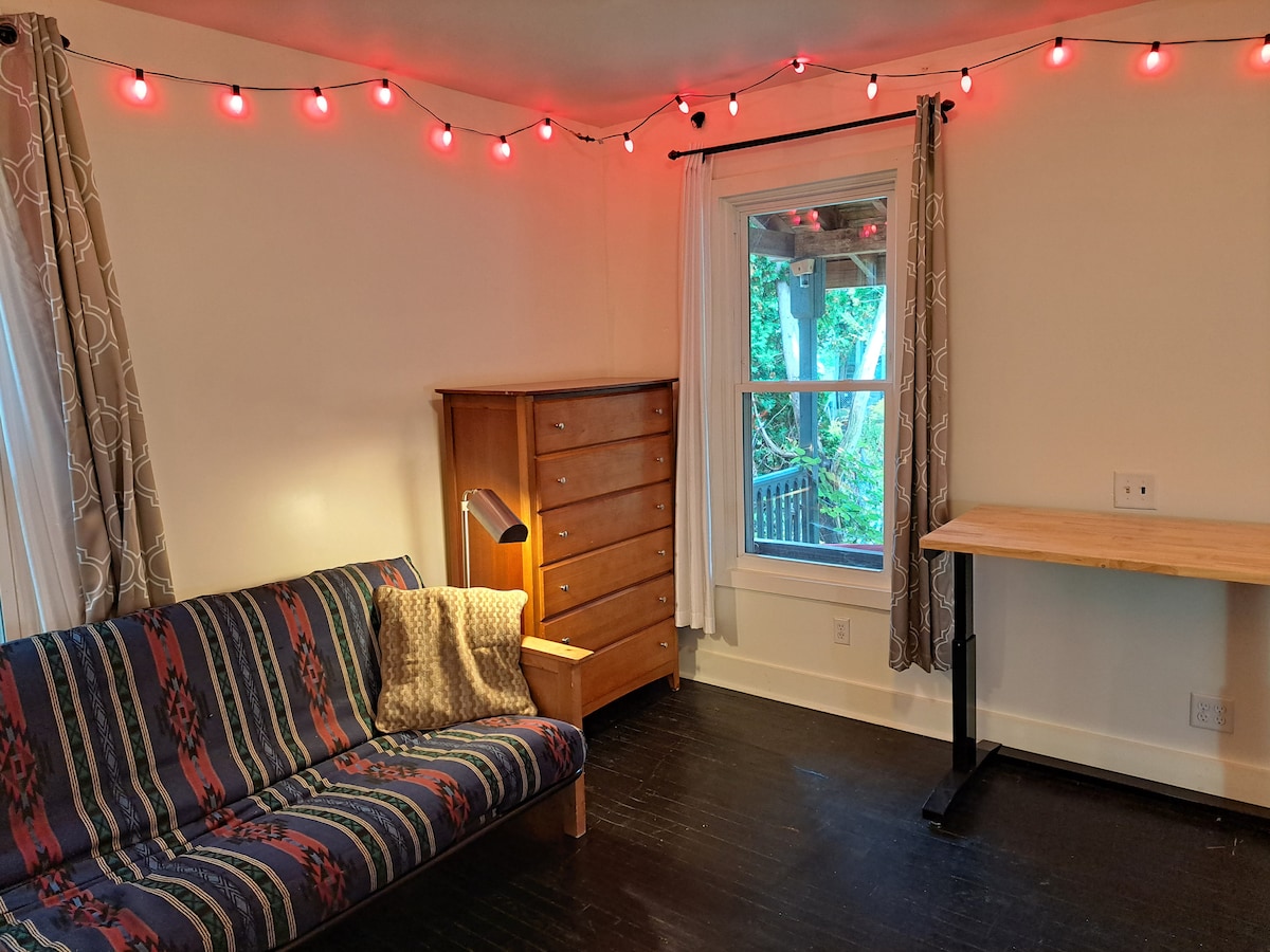The George Room is a small, private bedroom within a spacious, first-floor apartment. The apartment is in an Italianate 1910 duplex built by the Ebeling family on historic Prospect Hill. The private room has a comfortable twin bed, a closet, nightstand, two windows, and a 6-drawer dresser.
