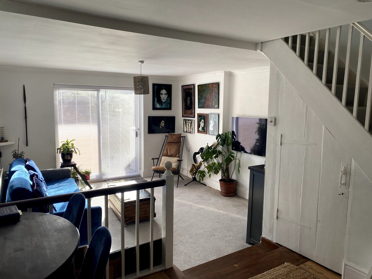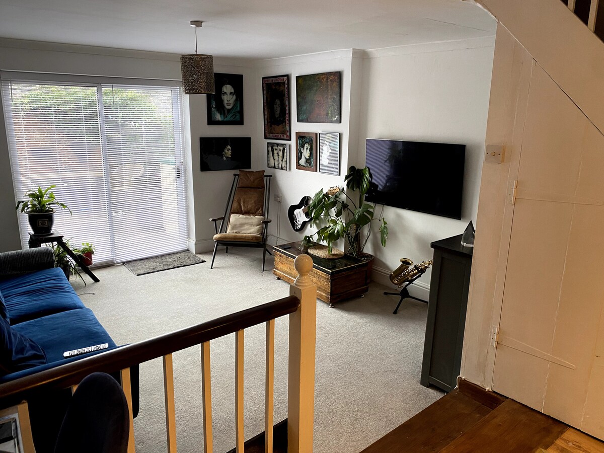 Tucked away from the high street, enter the property into the bright kitchen/diner, the kitchen features a large dining table with antique chairs and an exposed stone wall housing a feature cabinet. Head through into the cozy sitting room, where the exposed stone wall houses a fireplace with a wood-burning stove, as well as a new sofa to relax on whilst enjoying something on TV or curling up with a book from the bookshelf.