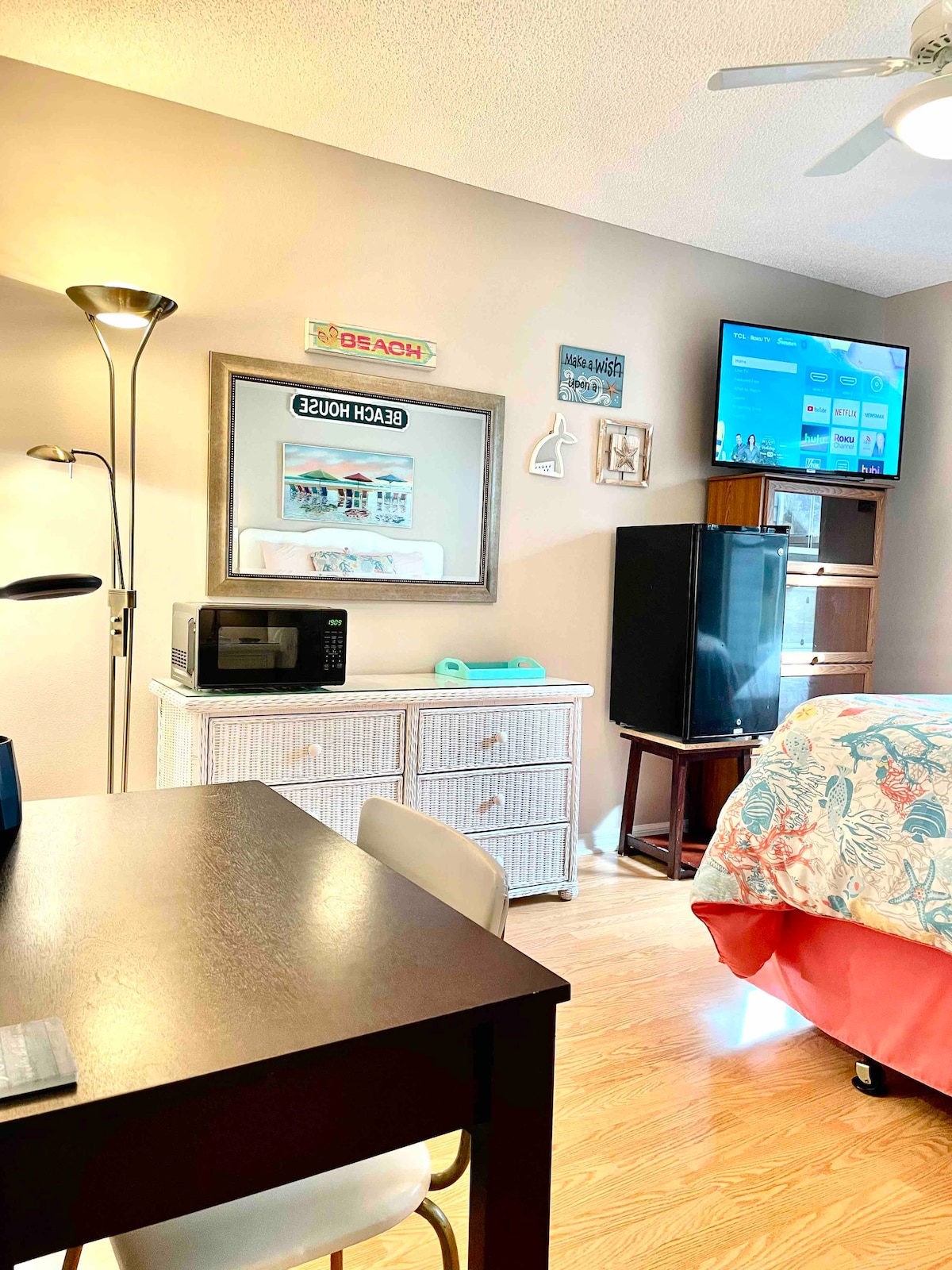 Welcome home! Each day you will wake up to an assortment of fresh fruit, bread, juice, tea and coffee. Don’t be surprised if you have fresh cookies outside your suite upon your return home, as I love making your experience above and beyond. I have reserved a shelf for you in the fridge and are welcome to cook in the fully equipped kitchen of zap a quick snack in the micro. You will also have access to the den with a large flat screen tv and a printer. We offer outdoor seating in the enclosed back yard so you can enjoy the swaying palms and the chirping birds eating hungrily from our feeders. The pool is just a block away. Guest passes available for pickleball, tennis, pools and more!
