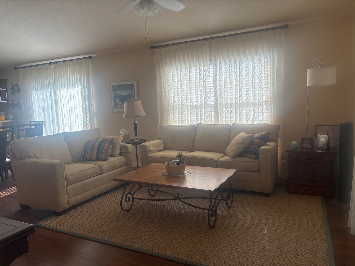 My home has recently become available to travelers . You will love the Location, Just a 5 min Golf cart ride to be able to Enjoy the Largest town square's restaurants, shops and of course the nightly music. Gas Golf cart for your use has side doors, no more rolling up and down the vinyl sides. Living room has great power couch and chair, so easy to put your feet up after a busy day. There is also a Murphy bed for any guests that may drop by. Love the enclosed Lani that lets you enjoy the outside even more.