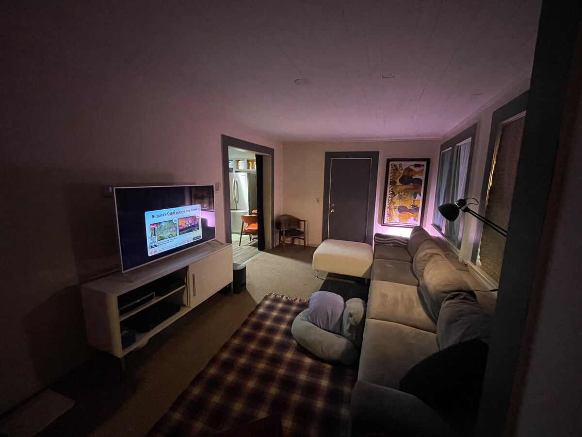 The exceptionally comfortable living room includes a lovely oversized sofa and a 65’’ flat-screen TV. If needed, the sofa in the living room is the size of an extra-long twin bed, and linens can be provided for an additional person.