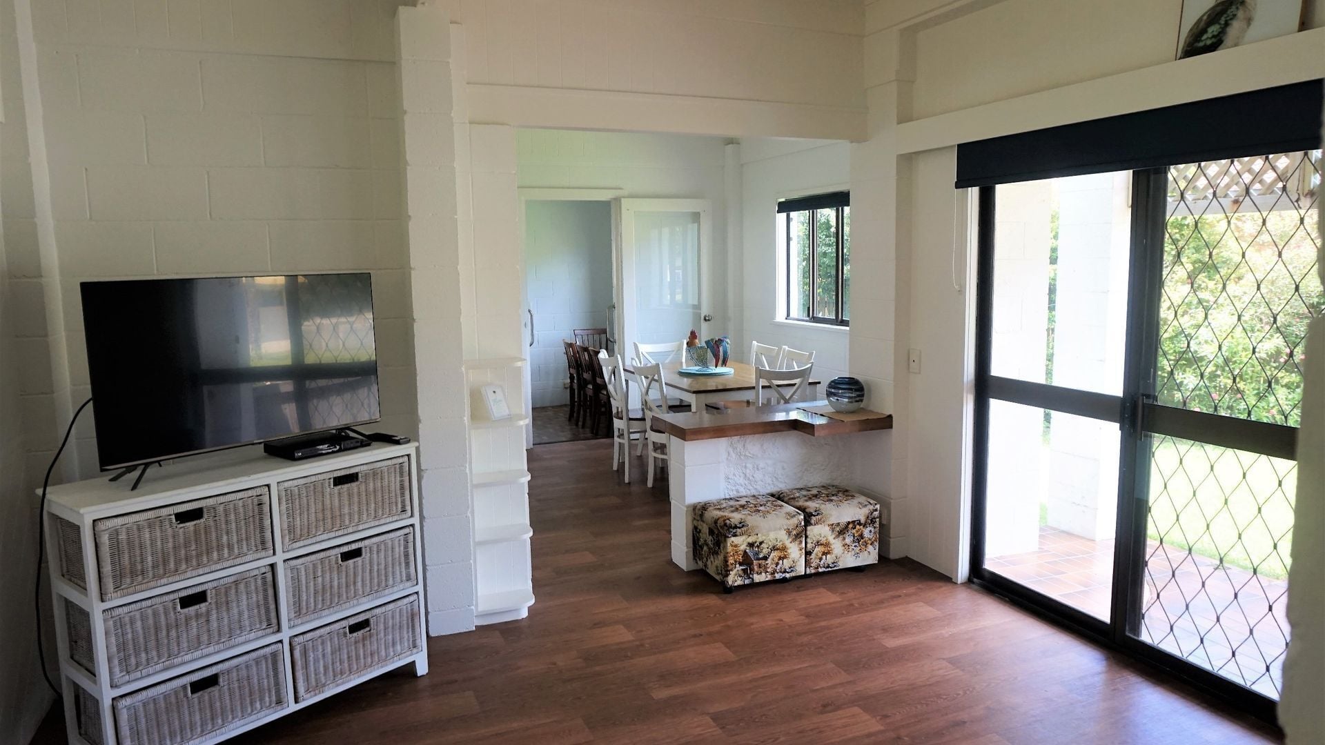 Open plan living and dining with comfortable lounges and dining table that seats 4 plus additional space for dining at the breakfast bar. The living space also includes an air conditioner and access to the front deck.
