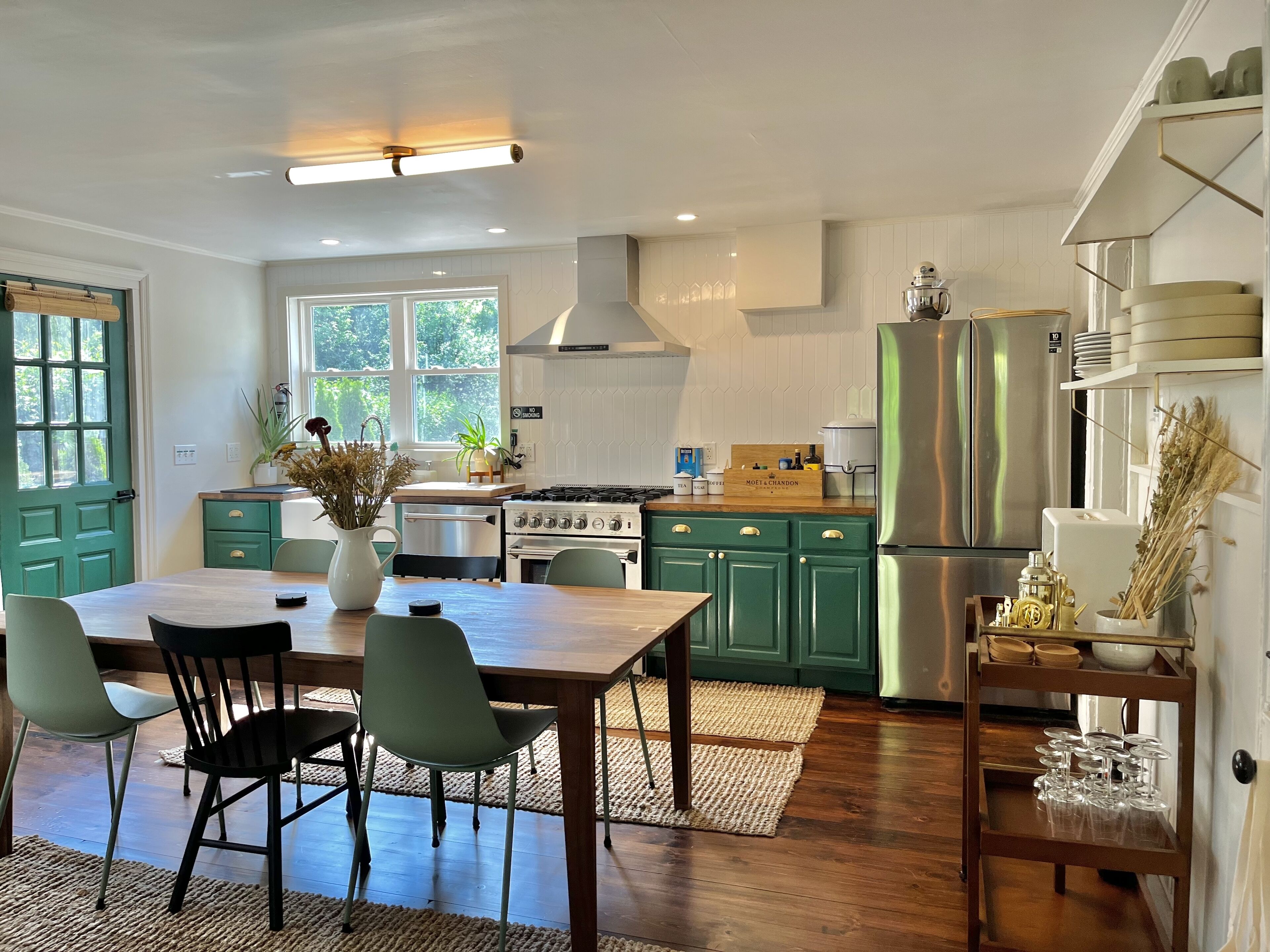 Rustic kitchen nicely equipped for your cooking pleasure. Plates, cups, mugs, utensils & pans included. Sub-Zero fridge with freezer, convection oven, cooktop, large sink. No dishwasher.