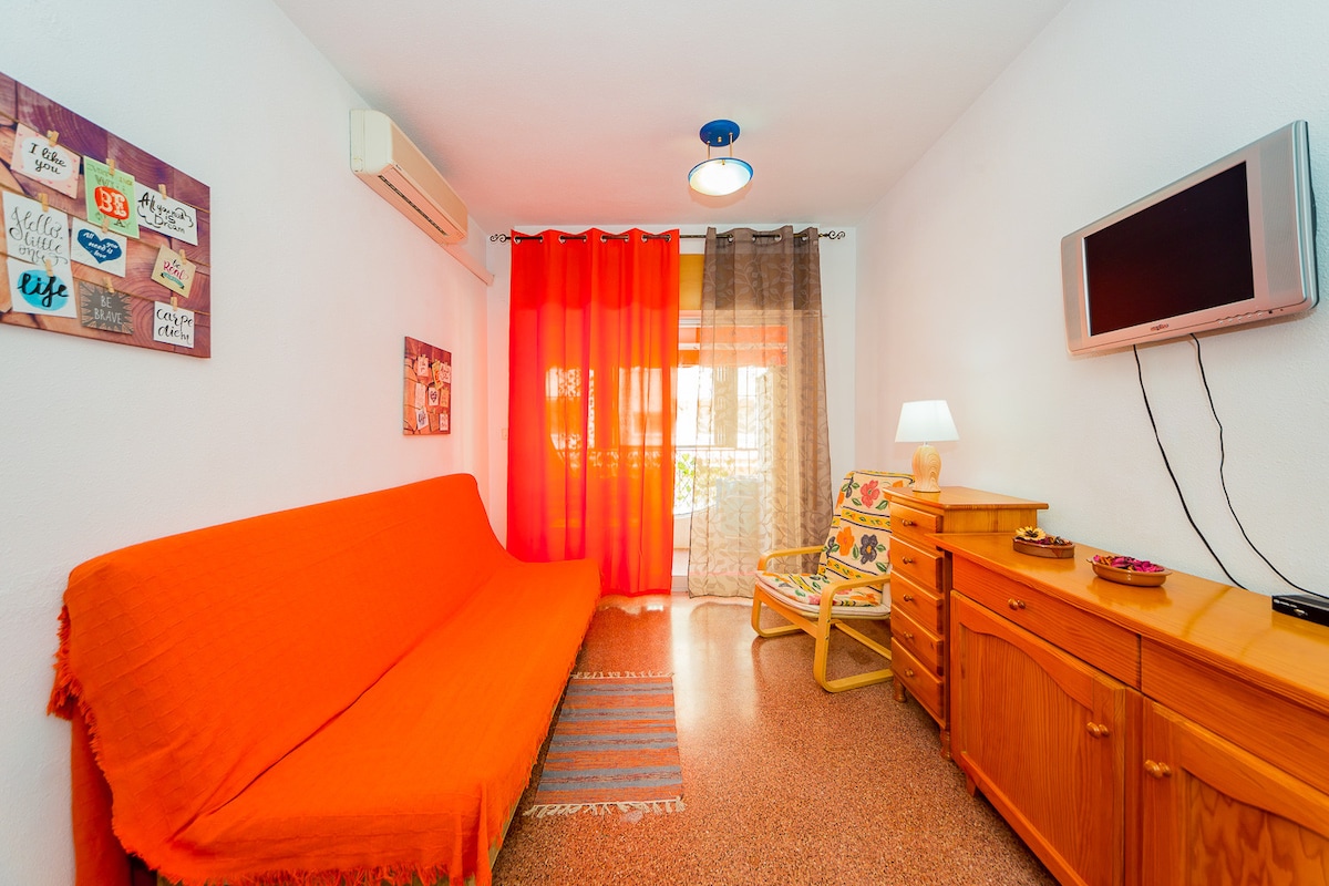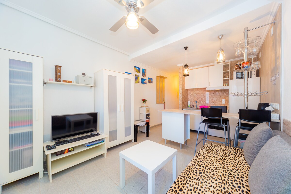 For rent studio spread out over 26 m2. It can sleep up to two people. The studio consists of a salon, kitchen, bathroom and a glazed terrace. It is equipped with furniture, appliances, dishes, bedding and towels. There is air conditioning. Spanish Tv is available. There are many tapas bars and restaurants, supermarkets and more local amenities all in walking distance. The blue flag beach of Del Cura beach is a 10 minute walk. Pets and smoking is not allowed in the property. There is no English television but almost all the shows and movies on Spanish channels can be seen in the original version (English).