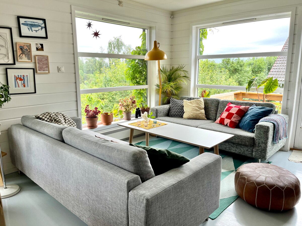 Welcome to our colorful home! We are a family of five, with children of 10, 13 and 18 years, mom and dad. Our neighborhood is quiet and the house is close to both nature and public transport. From the living room we have good views, and the house is nice and airy on a hill. Even though there are several houses close by, it feels private and sheltered. In the garden it is possible to relax, enjoy yourself by the fire pit or play on the lawn and trampoline.