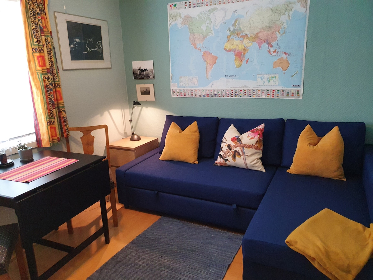 The room is part of a four-room apartment of 75 sqm with elevator. The room is 8.3 sqm. Furnished with a bed, office desk, office chair, cabinet with shelves and private smart TV with connection for PC. The apartment and room are on the third floor. To the right when you exit the elevator. I can arrange an extra mattress on the floor for an extra guest for an additional fee.
