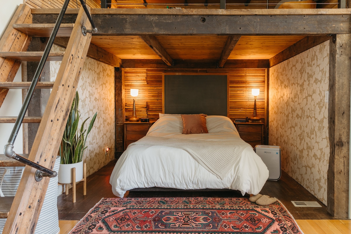 There’s a comfy queen bed on the main floor, and a queen-sized daybed in the loft for reading, lounging, or bringing a friend. A full kitchen sits beneath soaring windows, with everything you need to cook, snack, and sip coffee while looking over strawberry fields.