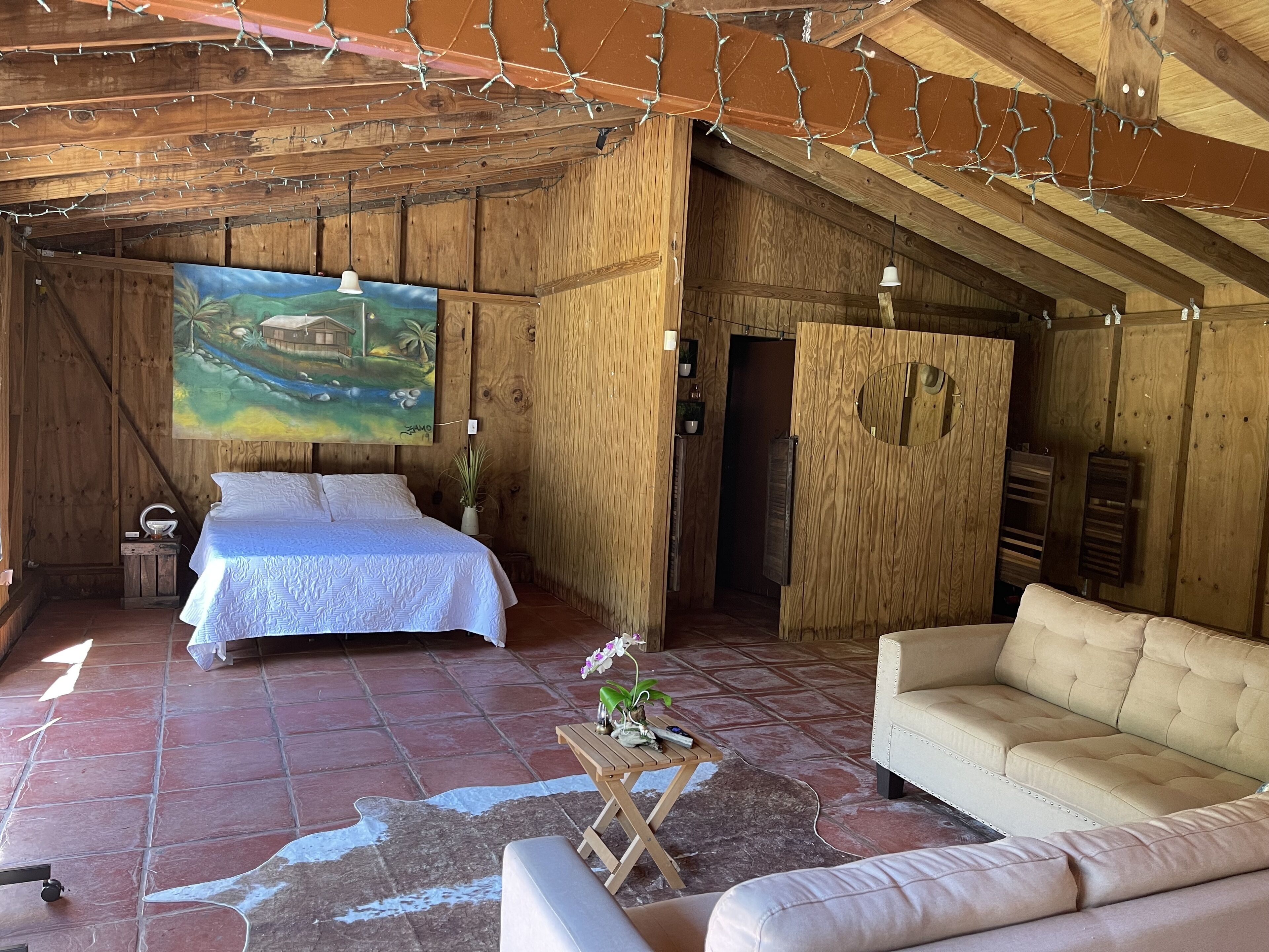 Relax in this calm, stylish eclectic space for 4 guest occupancy. We offered a private outdoor jacuzzi, bar area, and 19 acres of tropical forest with hiking trails just for yourself! Disconnect from the noise and delight yourself with the sounds of our native birds. Our trails offers hiking or "forest bathing" to contemplate what nature has to offer. We are located 5 min drive from downtown, 22 min from Cañón Blanco River, 26 min from Cueva Ventana (Cave) and 27 min from Tanamá River Tours.