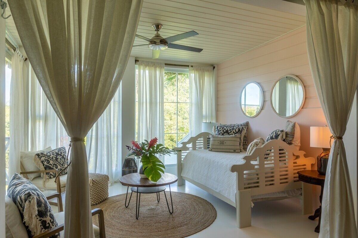 Master Bedroom: Unwind in a king-sized bed and enjoy the convenience of a private bathroom, a room complete with a dresser, TV, mini-fridge for beverages and snacks, and two large windows that can be opened to enjoy the views and breeze.