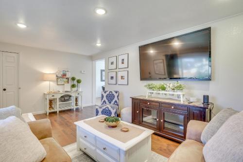 There is one full bath upstairs and a half bath downstairs. There is a comfortable full size living room with couches, end tables, coffee tables and a tv. There is a fully equipped kitchen stocked with pretty much everything that you would need. We have coffee pod makers with coffee and hot chocolate pods included. Seasonings abound. Fully stocked with dishes and cookware. Games in the cupboards and small selection of books as well.