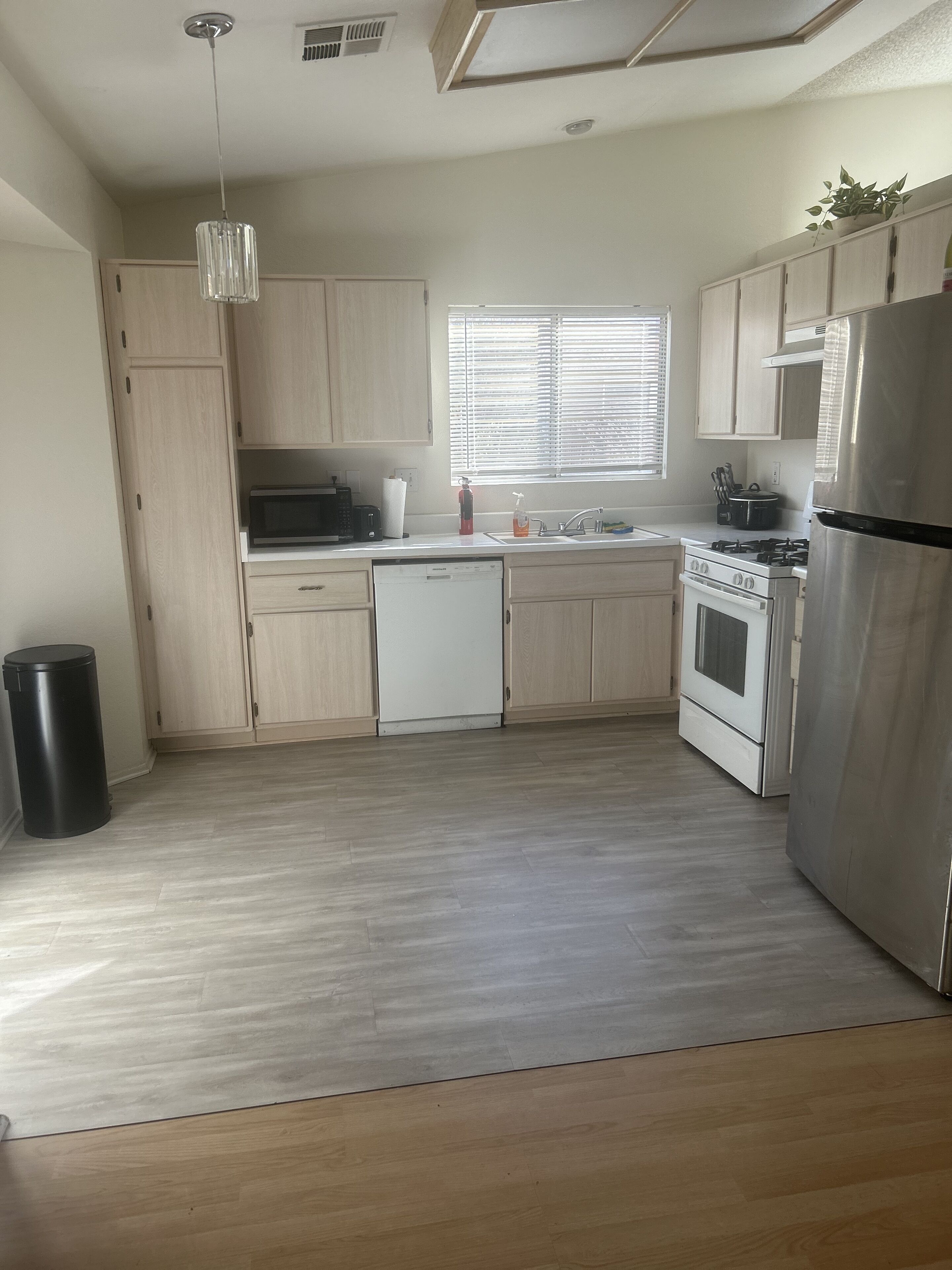 My home is considered a two bedroom, two bath house. In years previous, an owner converted a space in the garage into an additional room that includes the washer and dryer. This space is used for dual purpose. A bedroom and laundry space. It’s wonderful to be able to do laundry indoors during the hot desert summers and cold winters! There is no grass on my property, it’s more of a rock-scape! 😆 I don’t have green thumbs and that goes for all things chlorophyll! There is a nice covered backyard patio with a table to seat 6 and a couple’s swing to sit out at night and watch the stars or watch the satellites fly by.