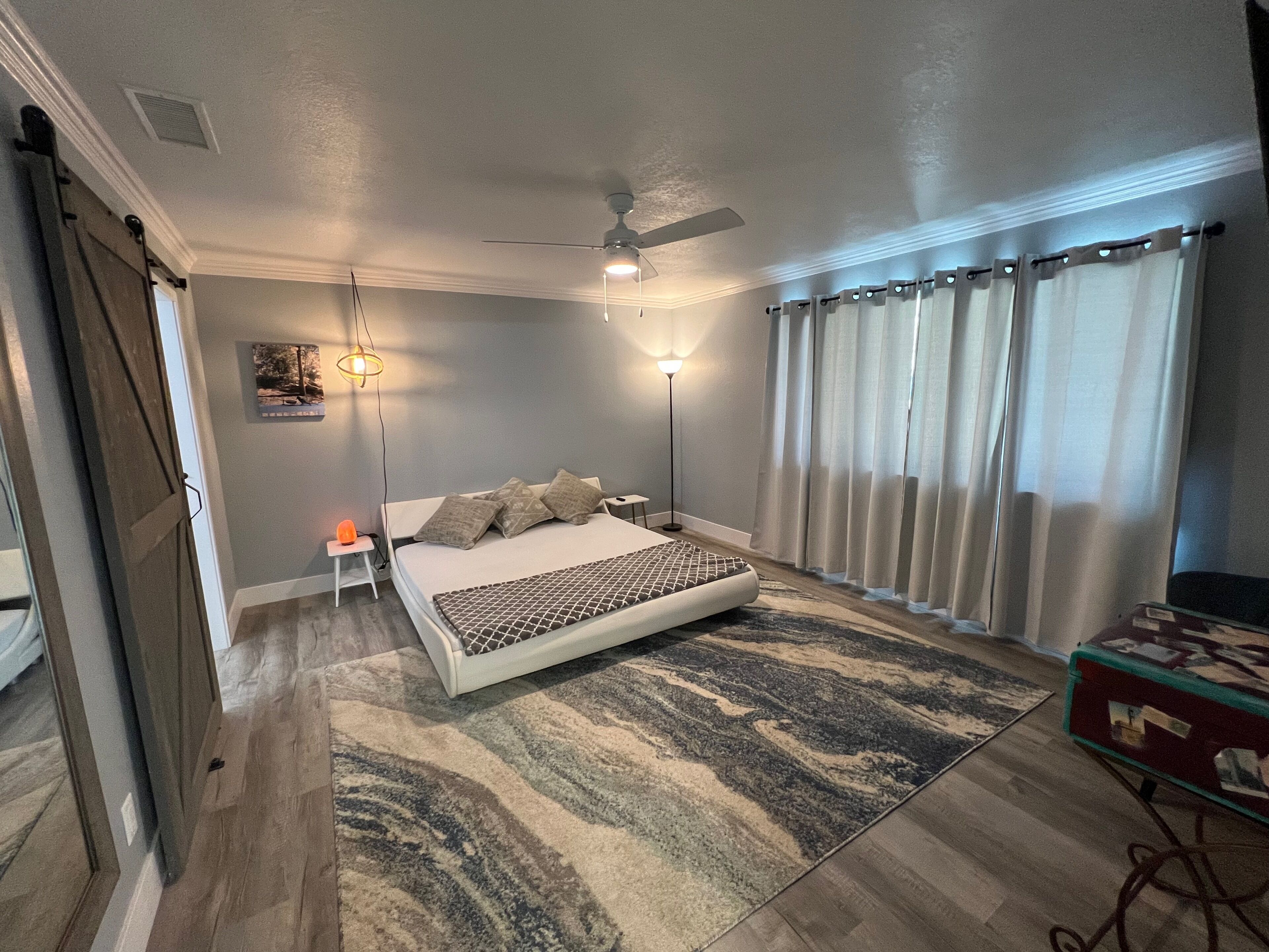 Large Jr. master bedroom with queen bed, large closet and dedicated bath in stylish two story home. Access to shared areas downstairs includes entry, living room, kitchen, dining room, laundry and outdoor areas.