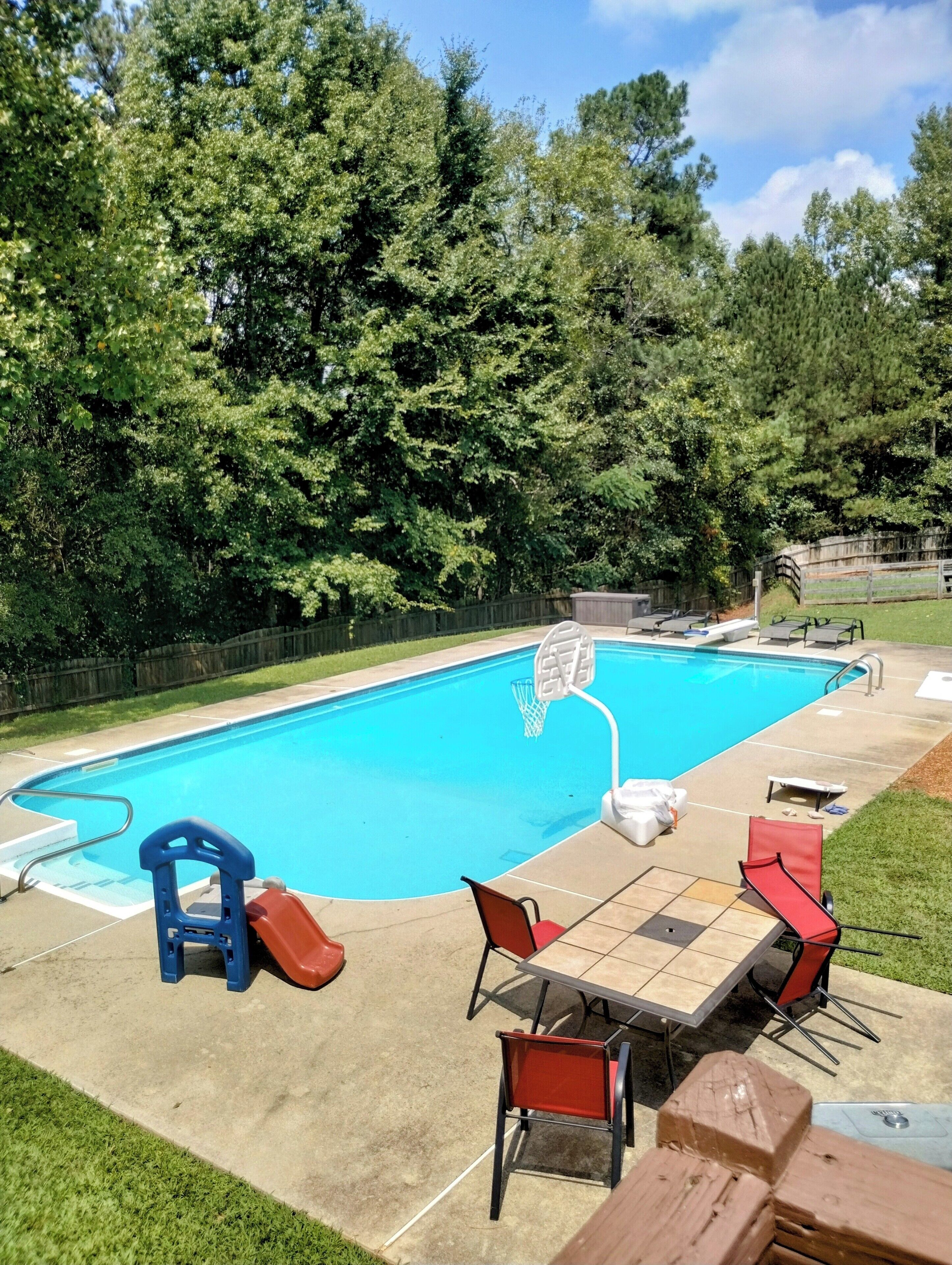 Summer time Fun and Relaxation. This beautiful home has everything for your relaxing family vacation. With 6 bedrooms and 5 full bathrooms there is enough space for everyone. The back yard has an in ground pool with lounge chairs surrounding it. There is an out door kitchen with a built in grill and eating area. A fenced in yard for your fur babies. This home is 25 min to Atlanta & close to grocery stores.