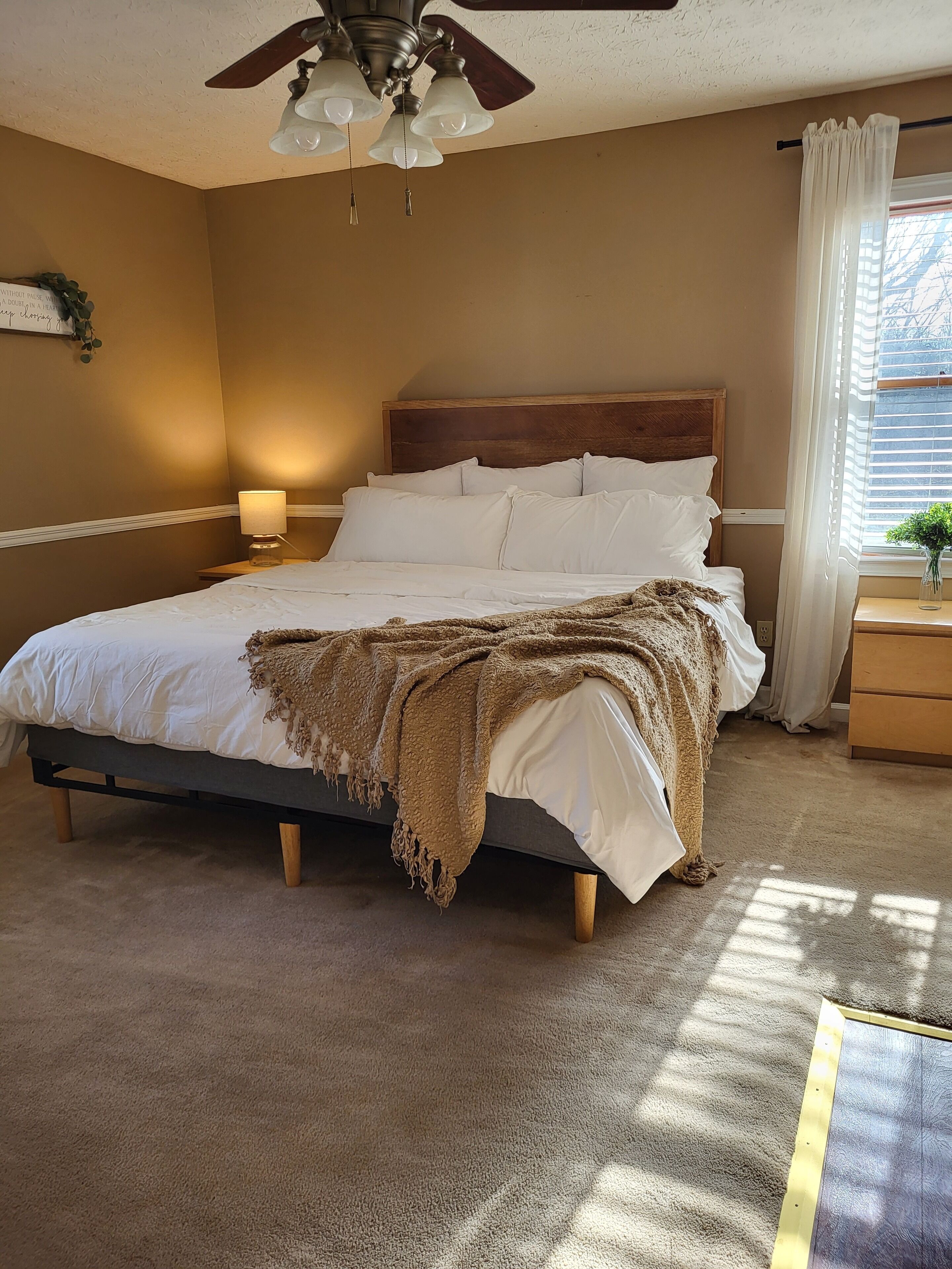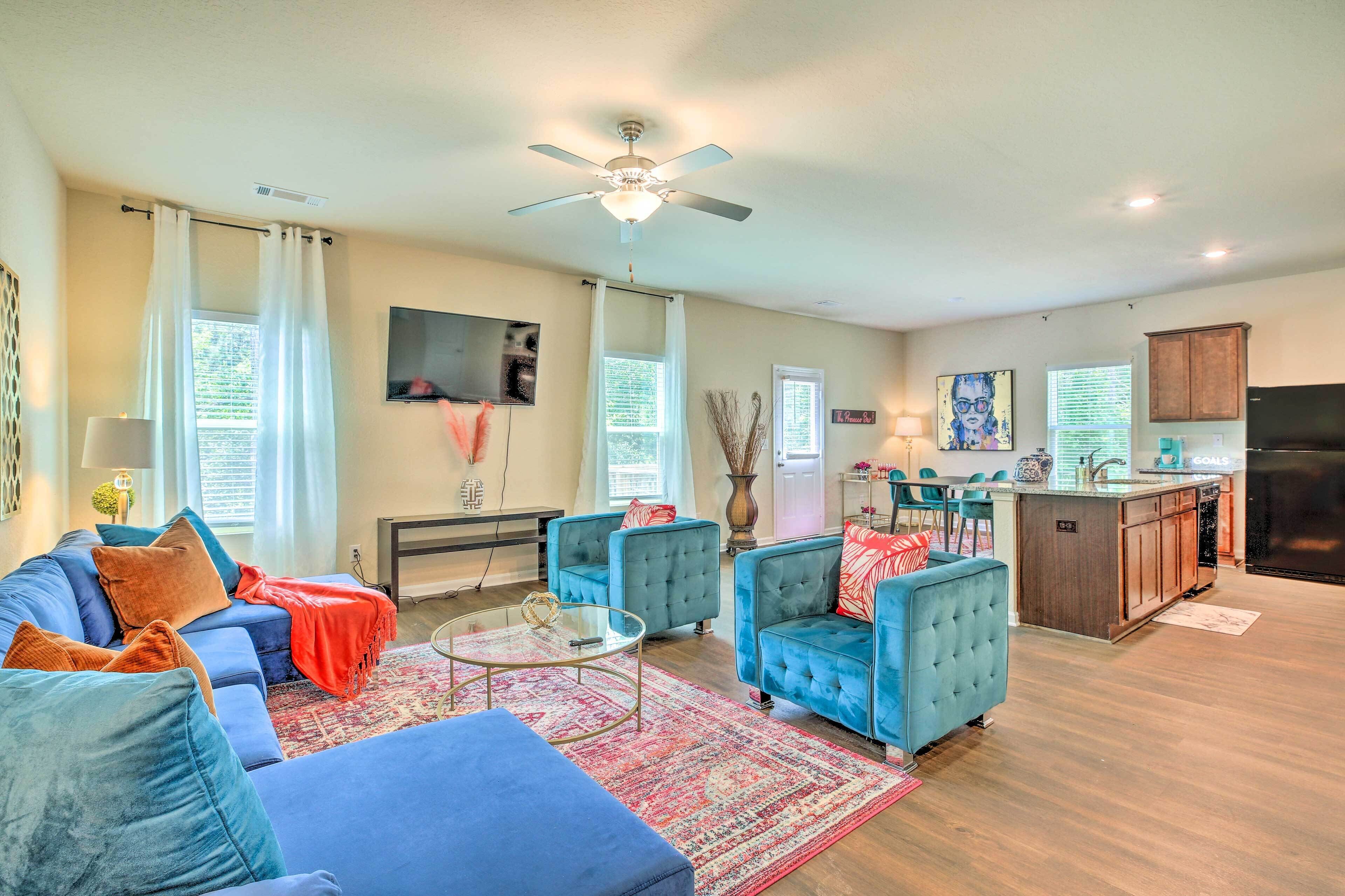 Homey and Spacious Master Bedroom - Featuring a queen bed with elevated decor, blackout curtains and smart TV. The spaciousness of this bedroom allows you to completely unpack, kick your feet up, and relax. For those traveling with young children, a Pack and Play is available on site, as well as a baby gate, with plenty of room to use within the master suite.