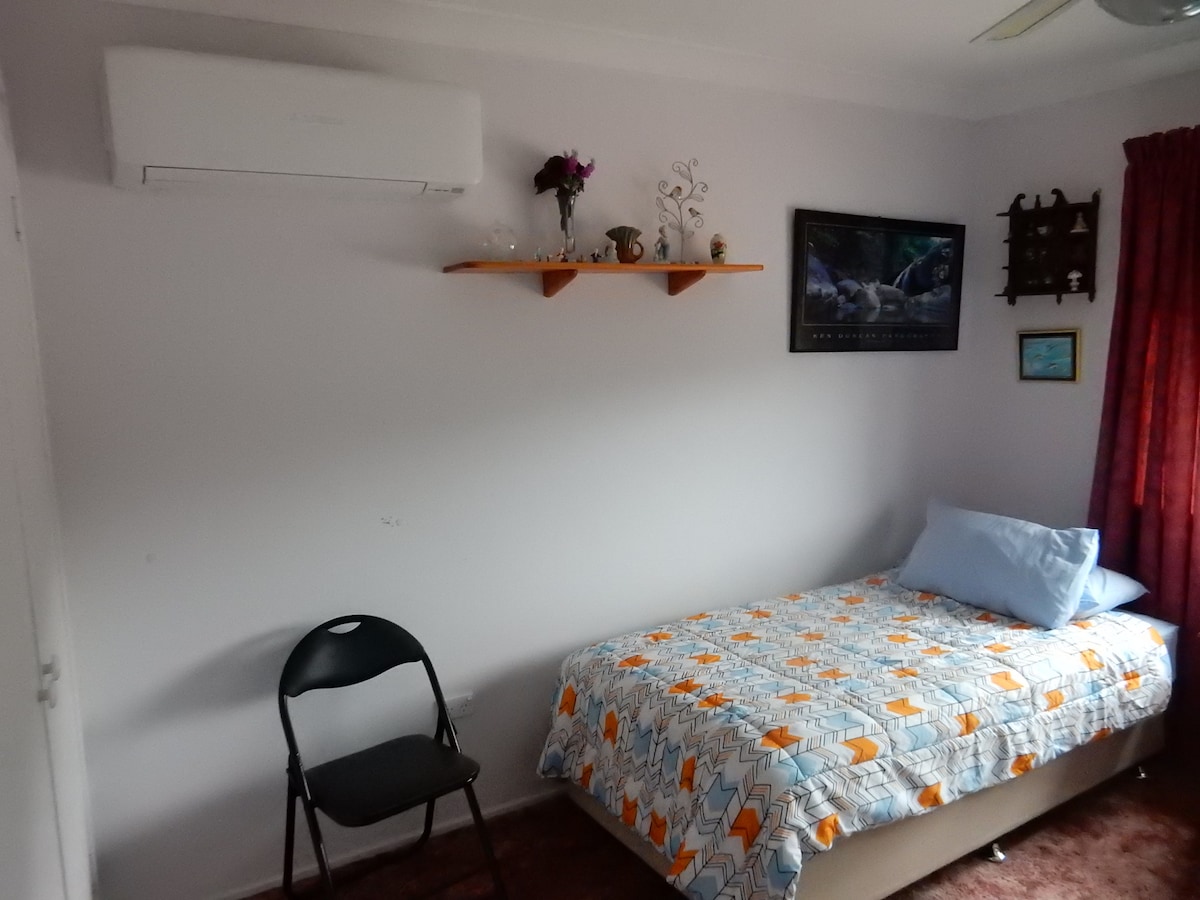 The room contains 2 single beds - one is a large king single, the other standard single. We welcome people from any Country. Its an upstairs room. Its clean and ready for use. Free unlimited Wi-Fi.