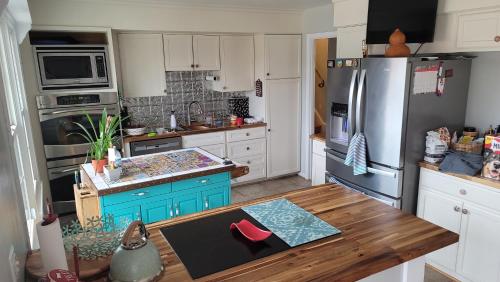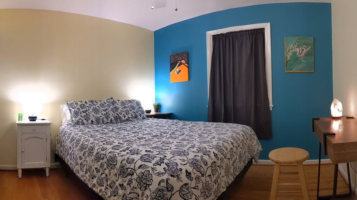 This upstairs bedroom includes everything you need for your stay. A comfortable queen bed (with new mattress), coffee maker, coffee, electric tea kettle, dedicated work space, small refrigerator with small freezer, and microwave can all be found in this rented room.