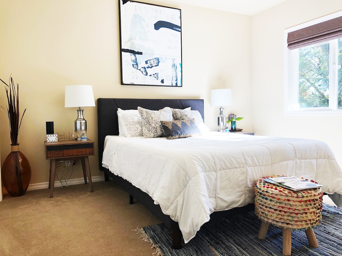 The space features: 1 bedroom with a king bed | 1 bedroom with 1 double bed and 1 pull-out bed | 1 bathroom with a separate door for shower/toilet | Kitchenette with a table for two | Large living room with 65" TV and Sonos surround speakers | a bridge across a pond to access a large landscaped backyard with a table & fire pit.