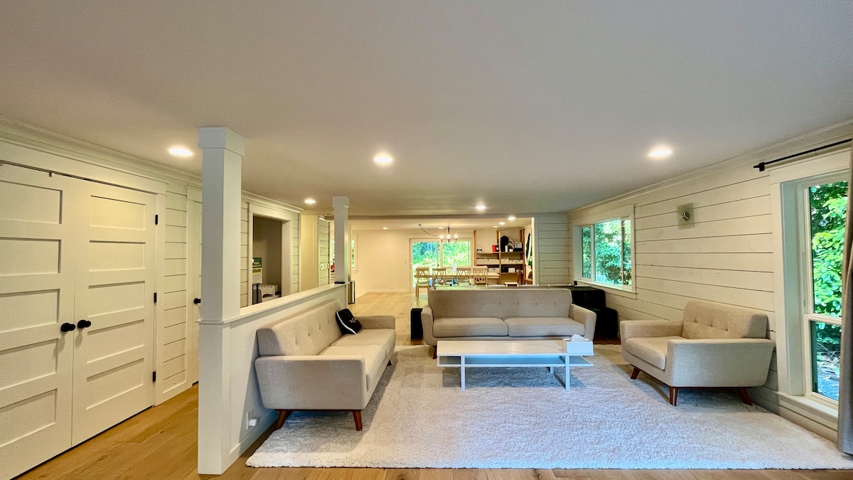 • Main House: One level, living room, dining room, kitchen, Primary bedroom w/ queen bed & ensuite bathroom, 2 bedrooms (one with queen bed and another with full bed), family room w/ smart TV & -shaped sofa, 1 full hallway bathroom and a half bath. Heating & cooling.